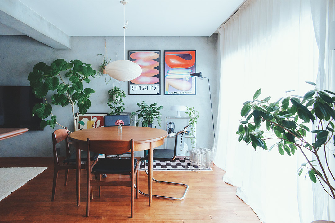 ガーゼカーテンから差し込むやわらかな光が心地いいダイニング。「わが家のカーテンは〈toolbox〉のガーゼカーテンで統一。クシュっとした質感が上品なんです」。ラウンドテーブルはイギリスの〈G-PLAN〉、ペンダントライトは〈イサム・ノグチ〉。空間のアクセントになっているA1サイズのアートは、海外のポスターサイト〈DROOL〉で購入したもの。