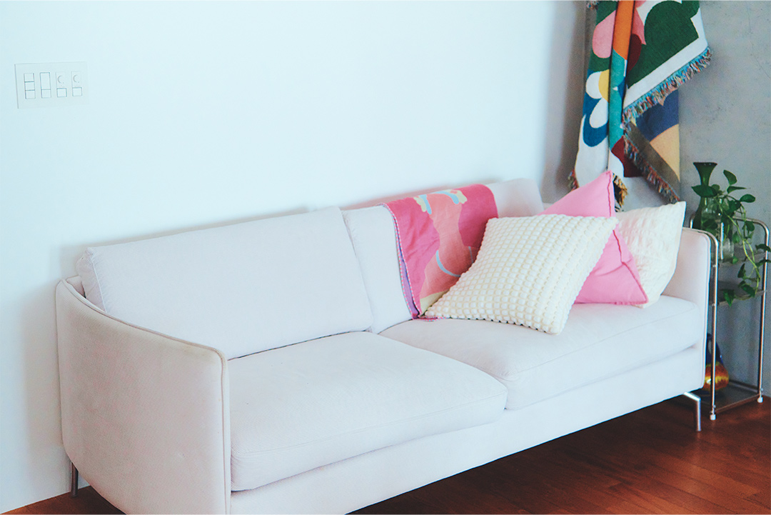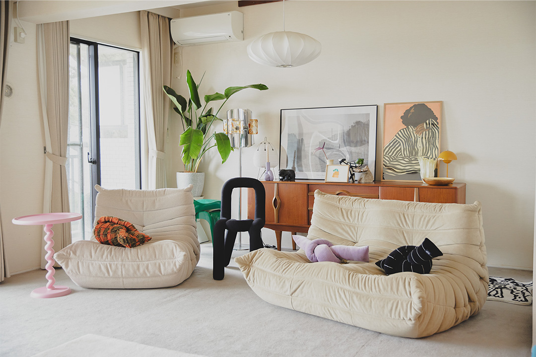 ソファは〈リーン・ロゼ〉のトーゴ。体を包み込む抜群の座り心地で、子どものお昼寝ベッドになることも。「子どもと過ごすときは、カバー代わりに大きめのブランケットをかけて汚れないようにしています。家具も妥協せず好きなものを選びたいので、その分子どもが幼いうちはカバーを敷くなど、汚れ対策は忘れません」。ソファの上に置かれたねじり型のクッションは〈JIUJIE〉。ふかふかで触り心地もよく、ころんと転がしておくだけで可愛い。
