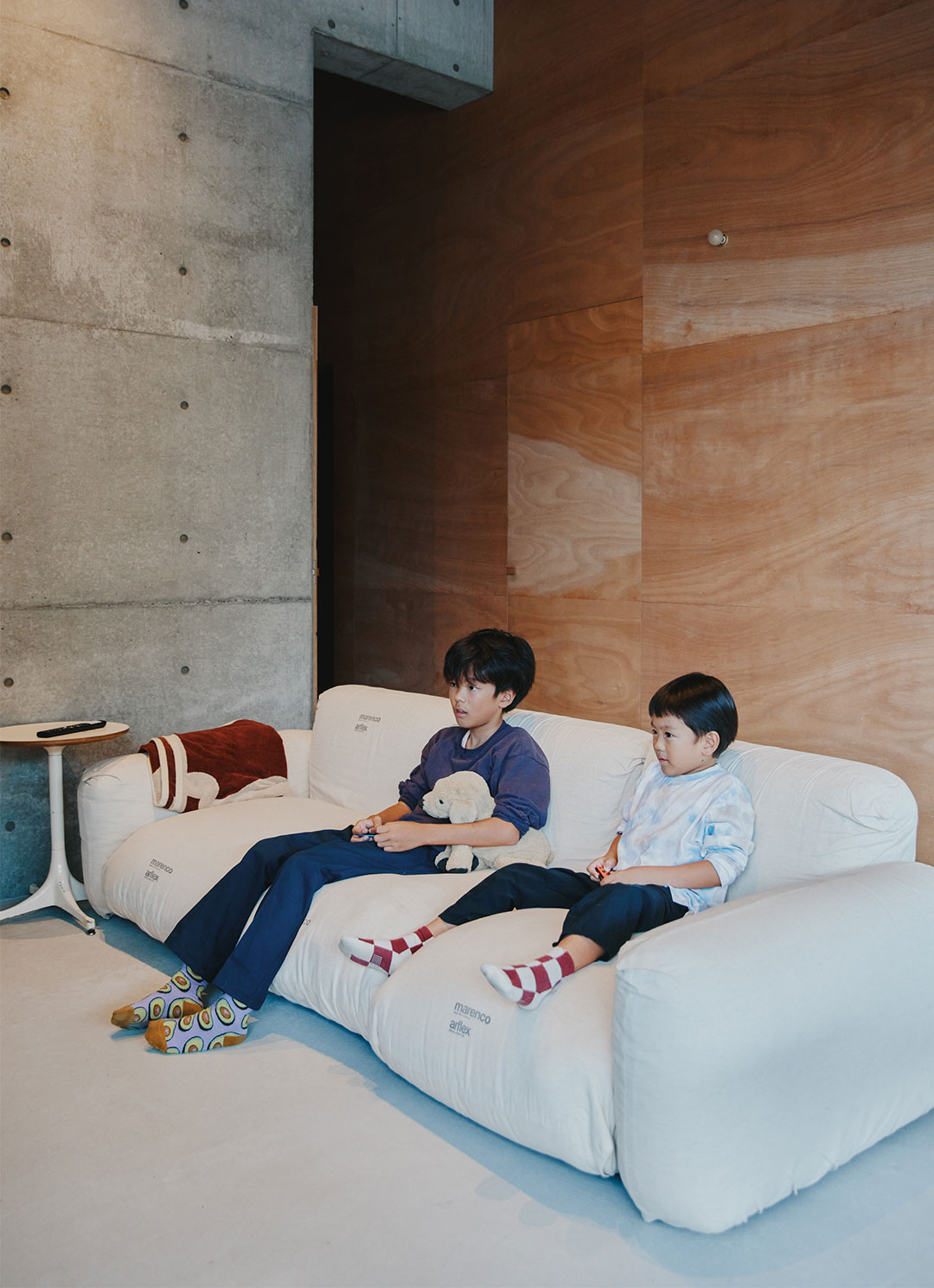 リビング脇のテレビスペースは、子どもたちのゲームスペースになることも。パパがしっかり綿を打ち直した〈マリオ・マレンコ〉のソファに座って、兄弟の大切な時間に。