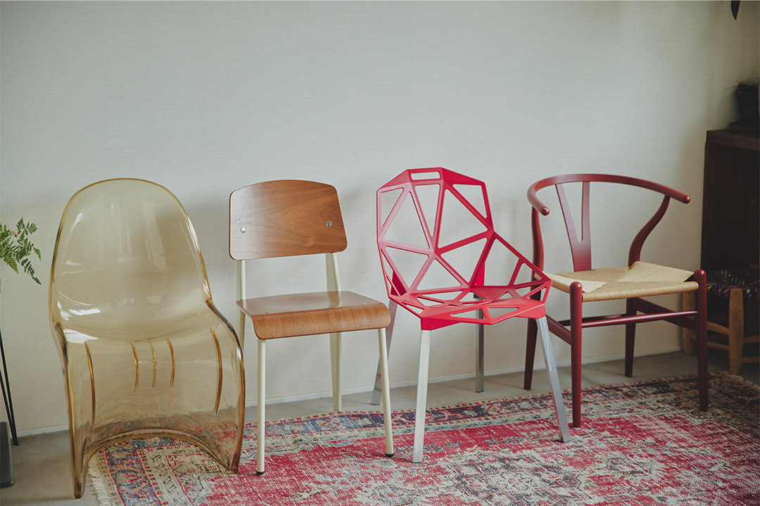 〈フィリップ・スタルク〉のAIチェアなど、部屋に合わせて椅子もカラフルに。「もともとインテリアにはあまり頓着しないほうだったのですが、この家に越してから家具選びが楽しくなり、椅子も合うものを買い揃えました」