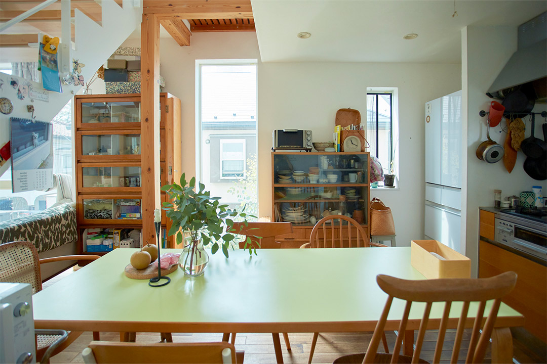 ダイニングテーブルは北欧家具を扱う〈haluta〉で見つけた〈アルヴァ・アアルト〉のもの。「ヴィンテージというほど古くはない90年代ぐらいのもので、珍しい爽やかなグリーンの天板がお気に入りです。友人たちにもよく褒められます!」