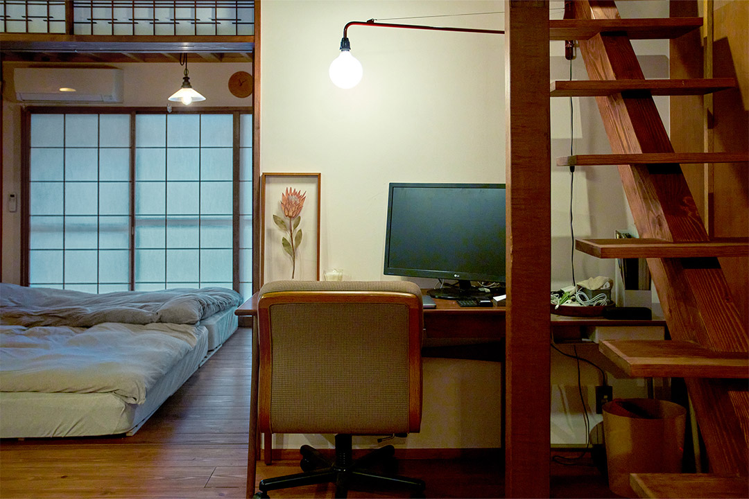 翔子さんのワークスペース。朱色のライトは〈ジャン・プルーヴェ〉が手がけた名作の「ポタンス」。〈ACME Furniture〉のデスクは奥行き50cmで省スペース。デスクの上に飾っている押し花アートは、友人のブランド〈FORMA〉の作品。