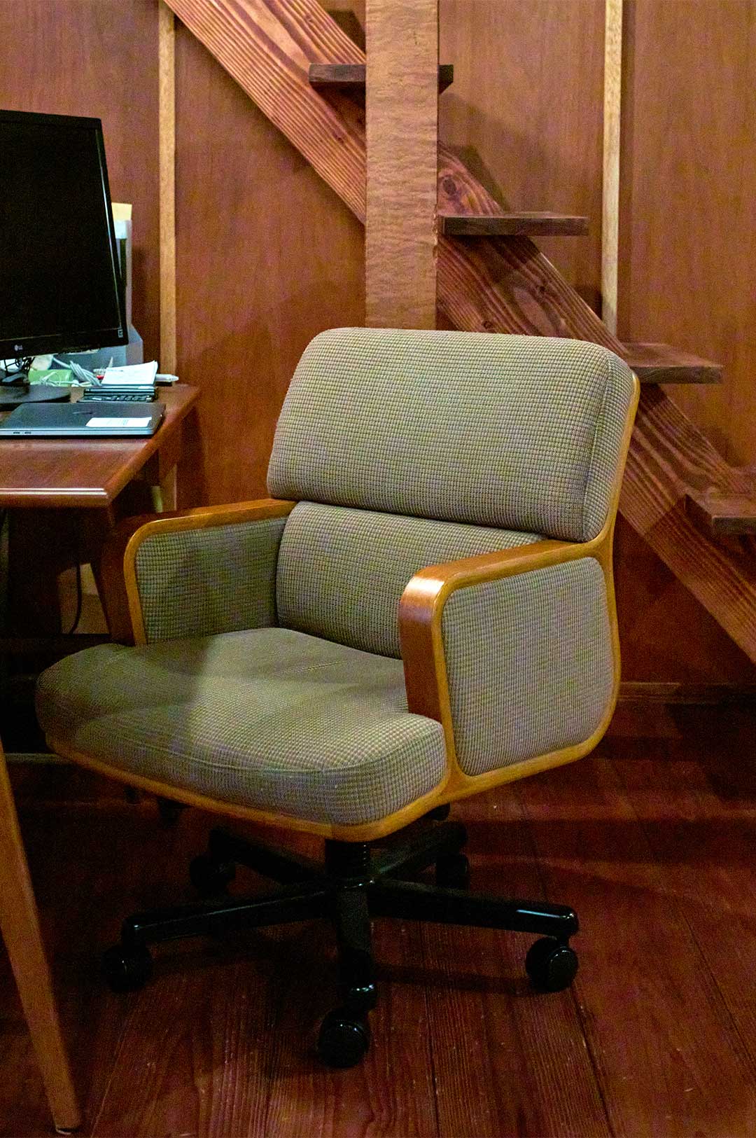 〈天童木工〉のワーキングチェア。肘掛けとフレームの継ぎ目がない、職人技の光るアイテム。