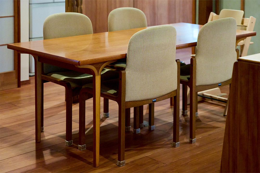 〈天童木工〉のダイニングセットは、〈D&DEPARTMENT〉で購入。「テーブルは長大作さんによるデザインで、なかなか手に入らないヴィンテージ品。曲げ加工が施された脚が美しいですよね」