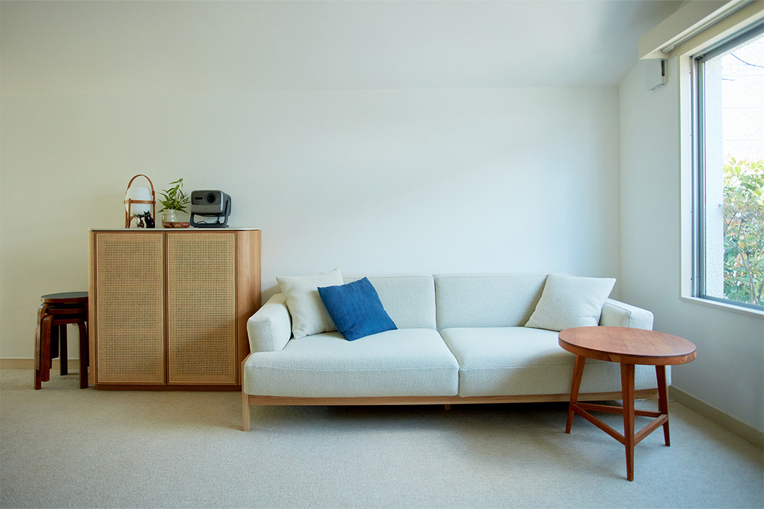 〈天童木工〉のロータイプソファは包み込まれるような座り心地が魅力。ひとりでも持ち運べるほど軽く気軽に移動できる。