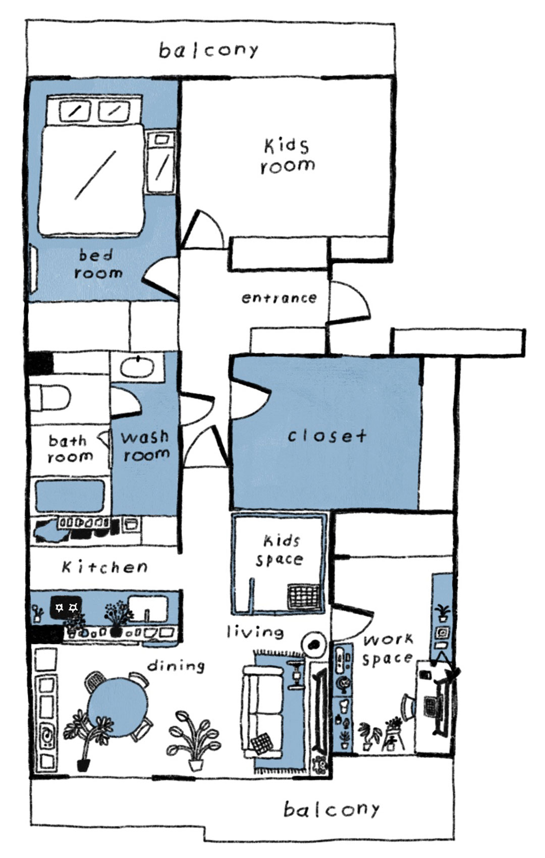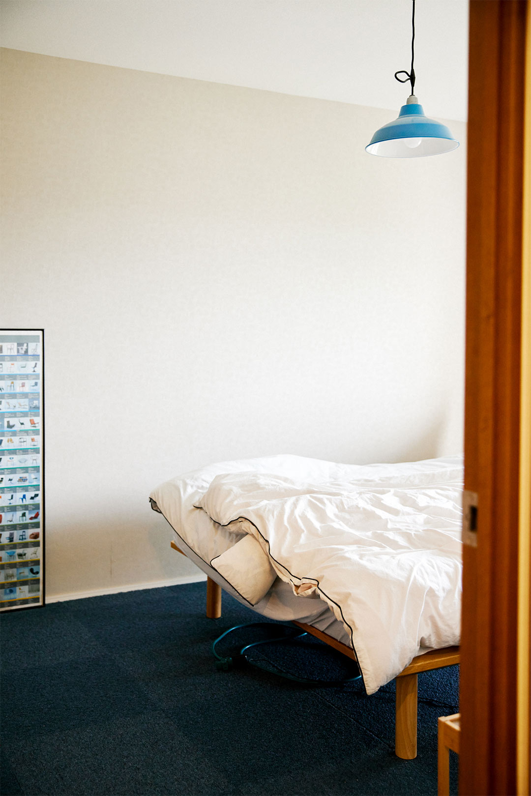 家族全員の寝室のテーマカラーは青。「菊池亜希子さんの責任編集ムック『マッシュ』に載っていた“寝室のフロアを青にする”という内容が、リラックスできそうだなと思っていたので取り入れました。実際、すごく落ち着きますね。フロアマットは総額で約¥15,000ほど。2時間程度で完成して、ほかの部屋とは違った雰囲気で気に入っています」(ユウヤさん)