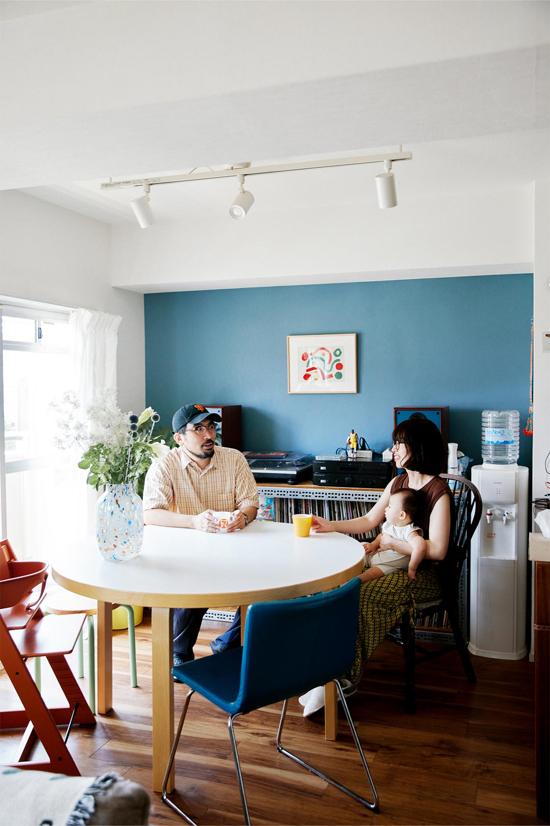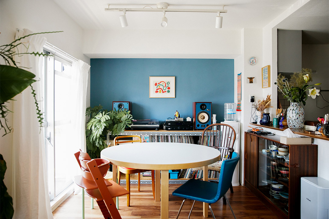 ダイニングの主役は〈Artek〉の円形テーブル。個性豊かなチェアとブルーの壁面、〈PACIFICA COLLECTIVES〉で購入した宮入圭太さんの型染め作品が空間を楽しく彩る。「昔から円卓に集っている様子に憧れがあって、引っ越しをしたタイミングで購入しました。大人数で集まるときはピザも広げやすくて助かっています。ただ、鍋料理のときだけは箸が届かず、少しだけ不便さを感じています(笑)」(ユウヤさん)