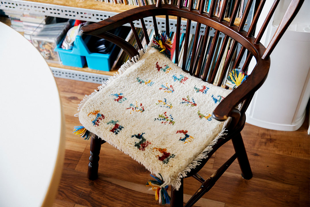 ユウヤさんゆかりの地・長野の〈松本民芸家具〉のウィンザーチェアには、企業のデットストックや規格外品を集めた、ユニークなイベント〈PASS THE BATON MARKET〉で千晴さんが購入したギャッペをオン。「ショップのインスタ投稿キャンペーンに参加したら、なんともうひとまわり大きいサイズのギャッペが当たったんです(笑)」(千晴さん)
