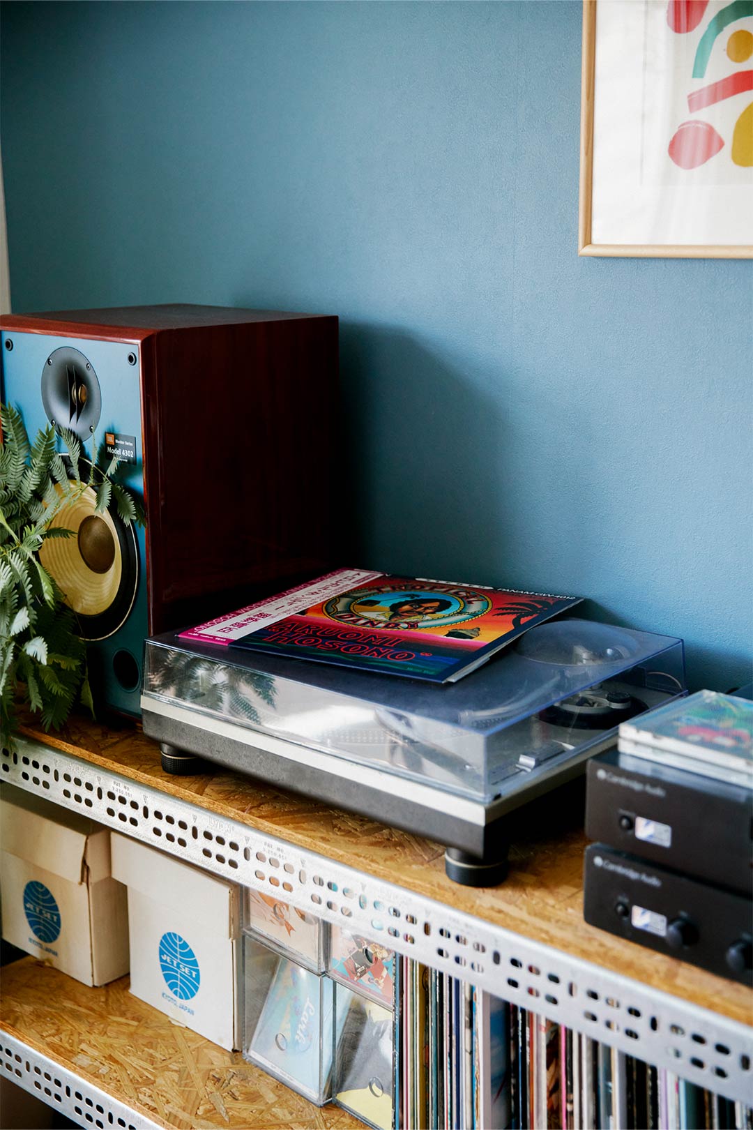 音楽好きのユウヤさんのコレクションが並ぶシェルフは、〈PACIFIC FURNITURE SERVICE〉でオーダー。ターンテーブルやアンプ、スピーカーもセットされ、ショップディスプレイのよう。
