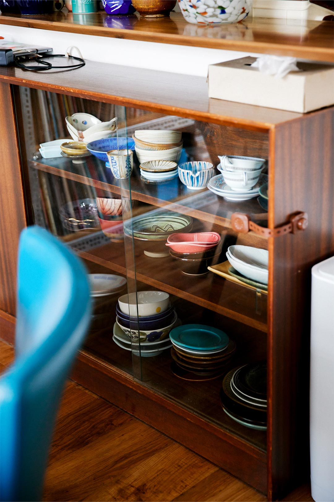 ヴィンテージ家具を取り扱う〈rocca rocca〉 で購入したカップボードは、イギリス製のもの。「器はふたりとも好きなので、お互い購入してきます。長野・松本市にある〈ちきりや〉の店主の方に“器は全部違うほうがおもしろいわよ”といわれてからは、あえて統一しないように心がけています」(ユウヤさん)