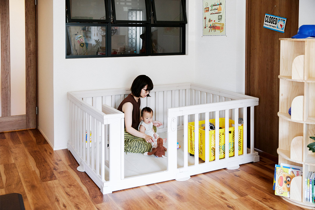 〈anuri〉のサークルに囲まれた、広々としたキッズスペース。「もともとマットを先に購入していたので、そのサイズに合わせてサークルを購入しました。韓国ブランドのもので、ベージュトーンのやわらかな色合いが気に入っています」(千晴さん)。近くには〈Amazon〉で購入した回転式のブックシェルフをセット。「たくさん読んでほしいという願いを込めて大きい本棚を購入しましたが、大きすぎました(笑)。これから少しずつ増えていく予定です」(ユウヤさん)