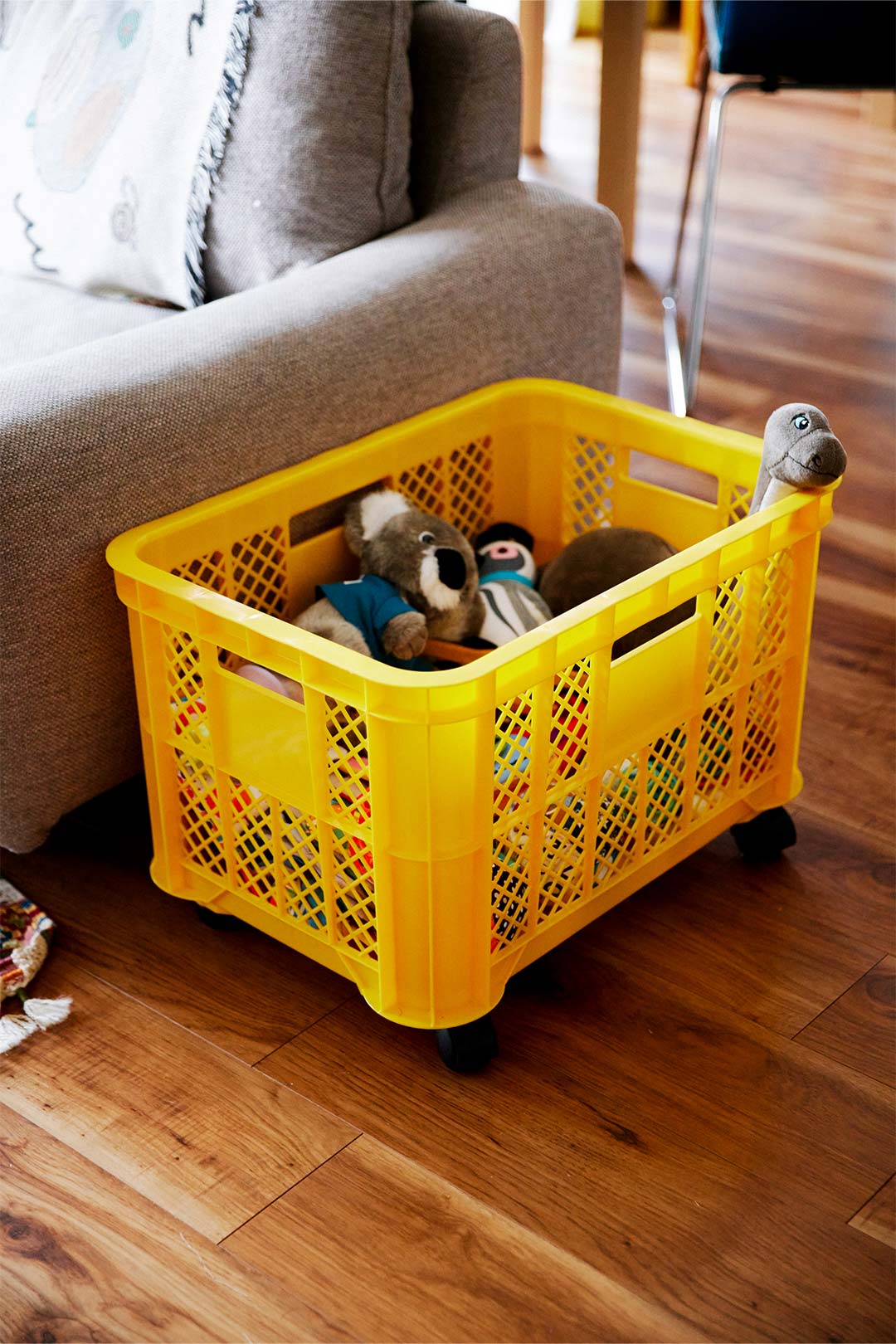 DIYでメッシュコンテナにタイヤを取り付けた、ユウヤさんお手製のオモチャ箱。大容量なうえに移動もラクラク。