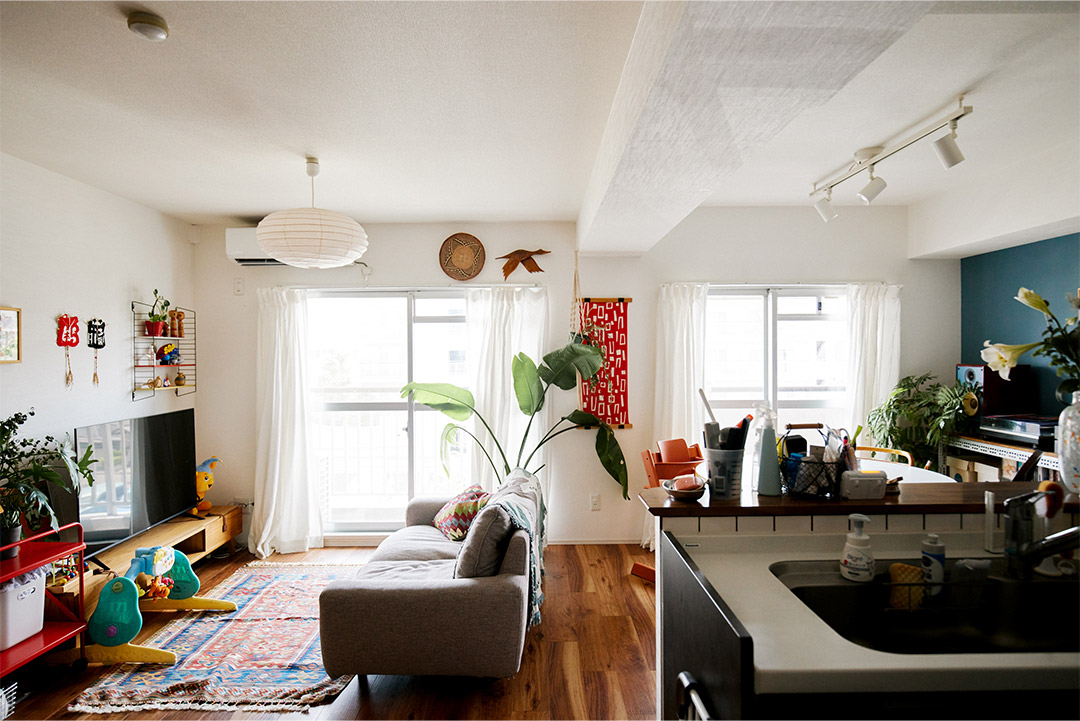ラグやディスプレイの色使いが明るい印象のリビングスペース。〈unico〉のソファと〈イサム・ノグチ〉AKARIシリーズのペンダントライトがリラックスムードを演出。「もともとポップなものが多かったので、子どもが生まれたことによって逆に自然になった印象があります」(ユウヤさん)
