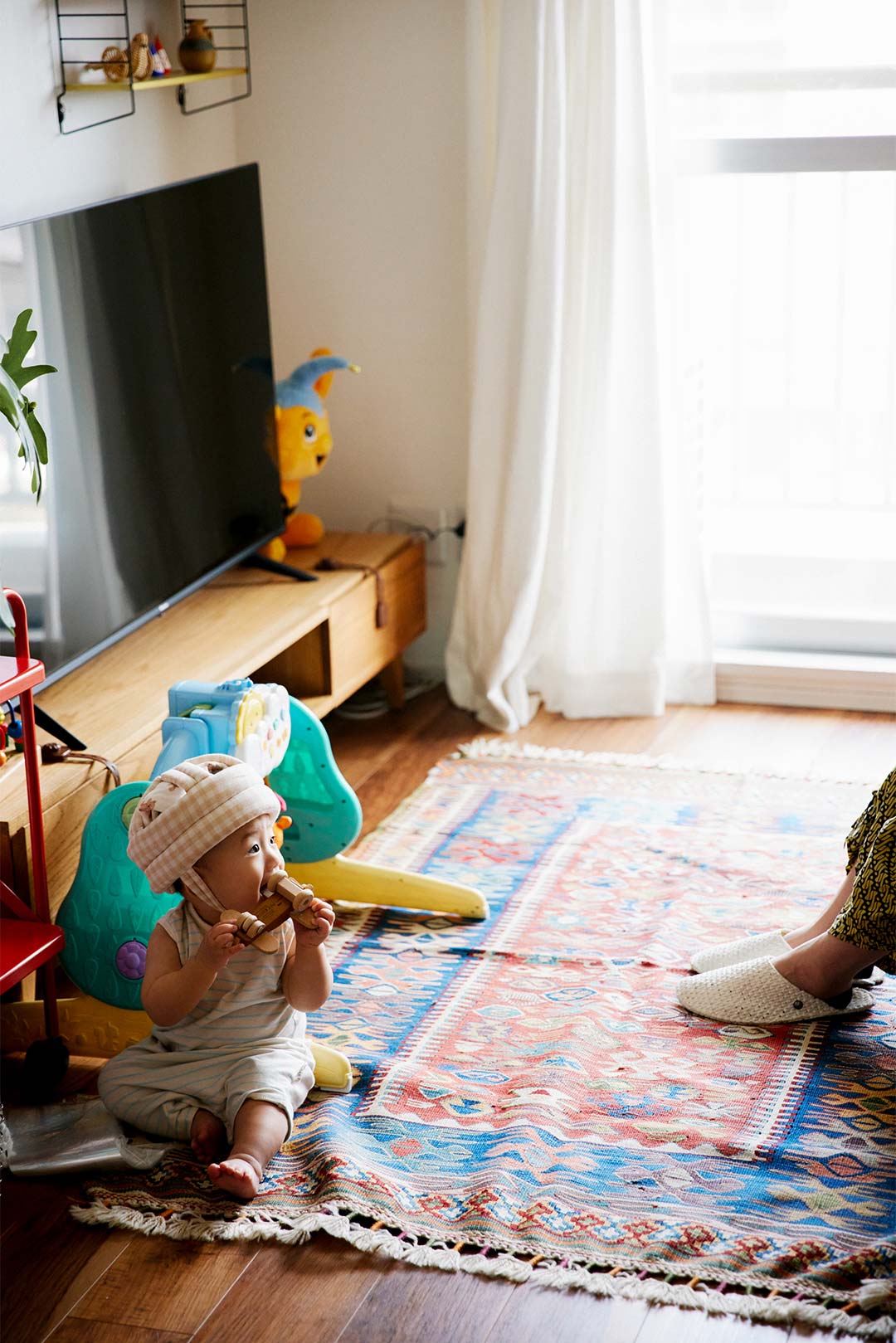手織りのぬくもりが伝わるトルコ・コンヤ地方製のキリムラグは、メリーとのカラーバランスもばっちり。朝くんの頭を守っているごっつん防止ヘルメットは、〈kerätä〉のibulシリーズ。「〈kerätä〉は信州のベビー・マタニティブランドですが、偶然にも僕の前々職の同僚が企画・デザインしたものだったので、驚きました!」(ユウヤさん)