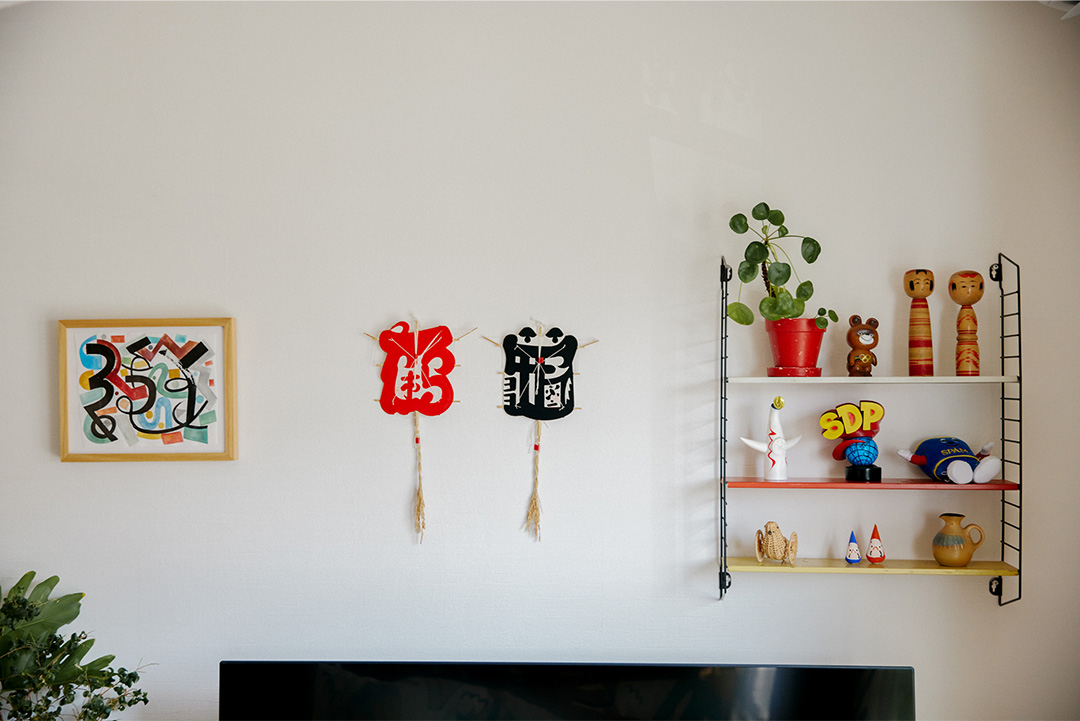 リビングの壁にもバランスよくお気に入りが並ぶ。左から渋谷の〈SHIBUYA PUBLISHING&BOOKSELLERS〉で出合った河合浩さんの作品、鶴と亀がモチーフになっている祝凧は、島根・出雲地方でつくられている縁起もの。オランダ〈TOMADO〉製のユニットシェルフは1950〜70年代製。長野・野沢温泉の鳩車や新潟の郷土玩具である三角だるま、太陽の塔、スチャダラパーの3Dロゴフィギュアなどが飾られている。「棚に並べるものはあえていろいろなものを置くようにしています」(ユウヤさん)