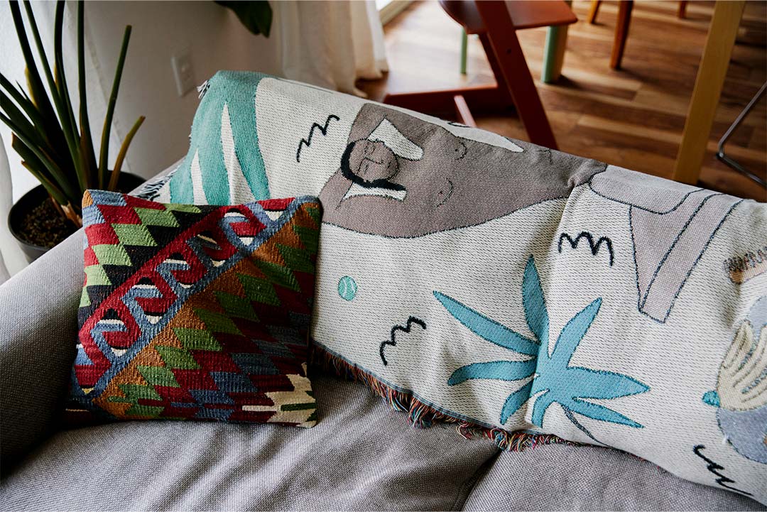 リリアン・マルティネスによるアートブランド〈bfgf〉のブランケットは、観葉植物とさりげなくリンクする柄をセレクト。存在感のあるクッションカバーは、コットンキリム生地のもの。
