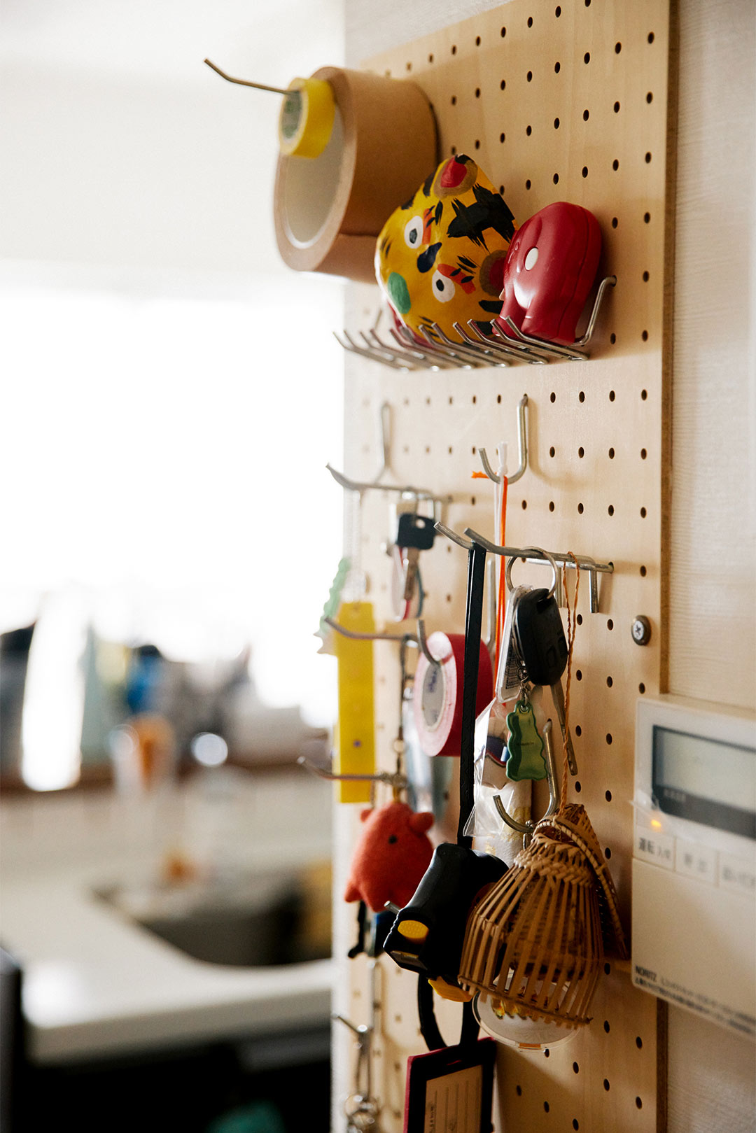 有孔ボードを活用した小物スペースは、鍵やメジャー、テープなどを飾りながら収納。「もともと古いインターホンがついていた場所で、リノベのときに撤去してもらったら、大きな穴が残ってしまって……穴隠しです(笑)」(千晴さん)