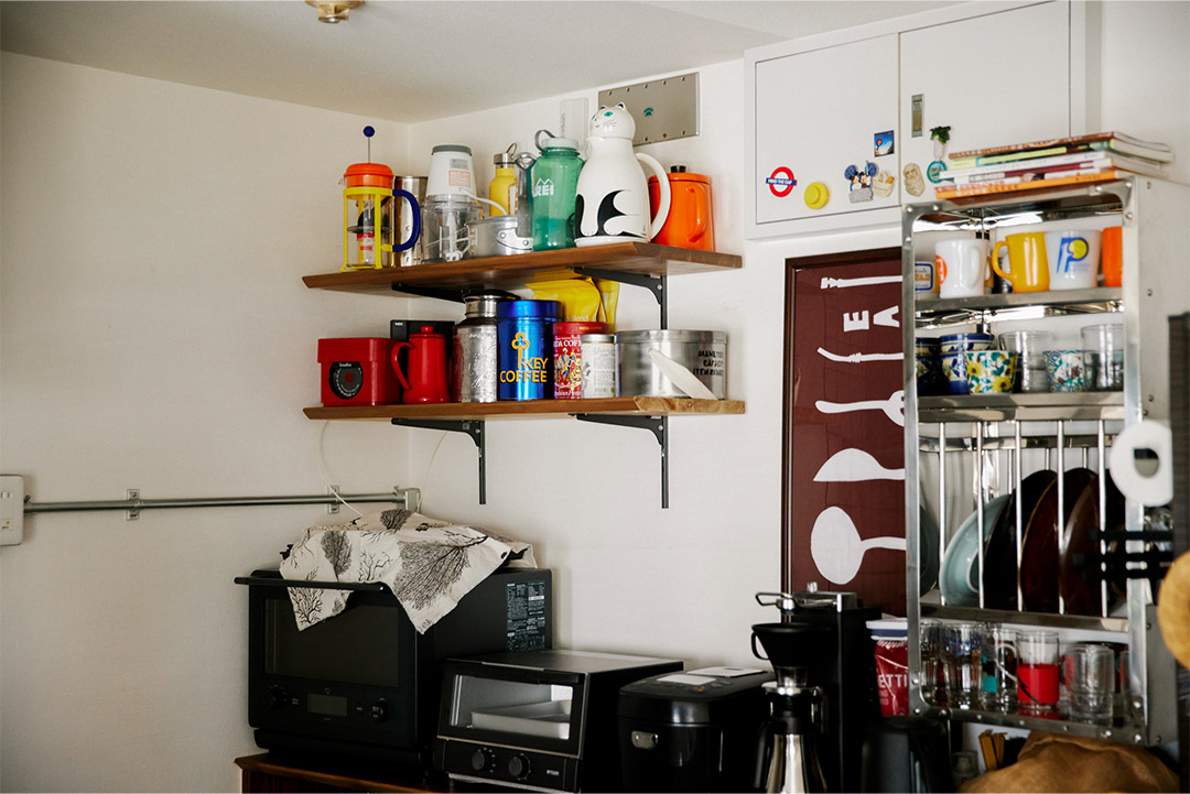 〈HAY〉のスチールラックやダクトを露出させたコンセントなど、スタイリッシュなキッチンは、リノベーション時に棚を造作。〈helios〉のキャット バキュームサーモジャグや〈月兎〉のホーローポット、〈Fire-King〉のマグなど、レトロポップなグッズが楽しく並ぶ。「持ち回り制でふたりとも料理をするので、キッチンはお互いが使いやすい状態にしています。食器やカトラリーといった細々したものは夫が揃えていますが、家電などより実用的なものは私が担当」(千晴さん)。「家電に関しては興味ゼロなんです(笑)」(ユウヤさん)