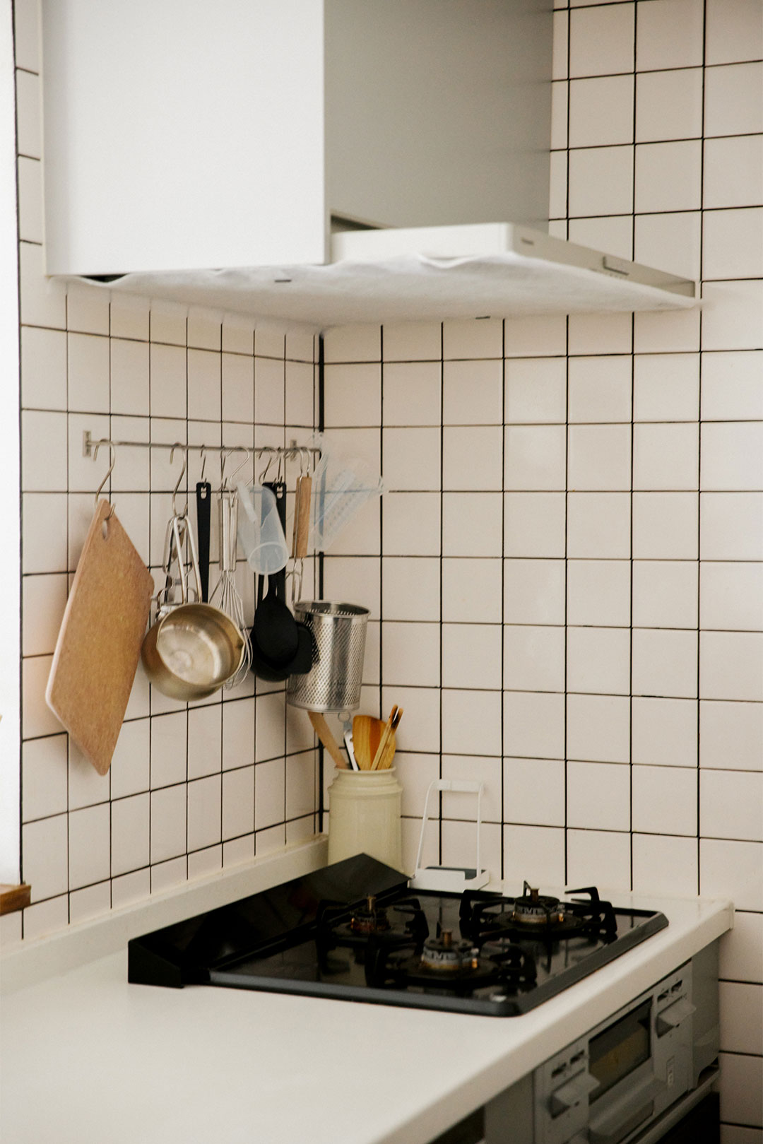 リノベーションの際に加えた清潔感のある白タイル。コンロまわりはぶら下げる収納で、日常使いのキッチンツールもすっきりと。