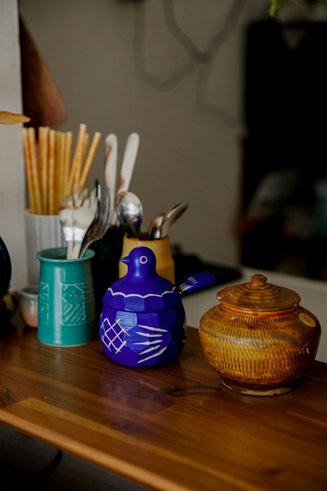 キッチンカウターには、長野・上田市で長く親しまれている鳩の砂糖壺が可愛く佇む。「木製で、尻尾部分がスプーンの持ち手になっています。上田では喫茶店に置いてあったりします。隣に並ぶ小鹿田焼きの壺は塩入れに。友人からのおみやげです」(ユウヤさん)