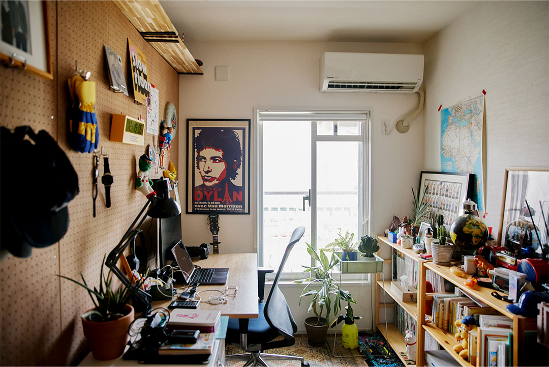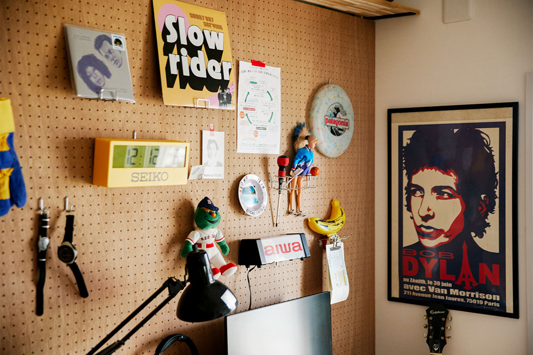 DIYで取り付けた壁一面の有孔ボード&本棚にはユウヤさんのコレクションがずらり。「仕事部屋といいながら、好きなものだらけです。今後も増えていきそうなので、棚も増やしました。もともと妻がリモートで使っていた部屋ですが、僕がフリーランスになって自宅で仕事をするようになったので、一気に侵略しました」(ユウヤさん)