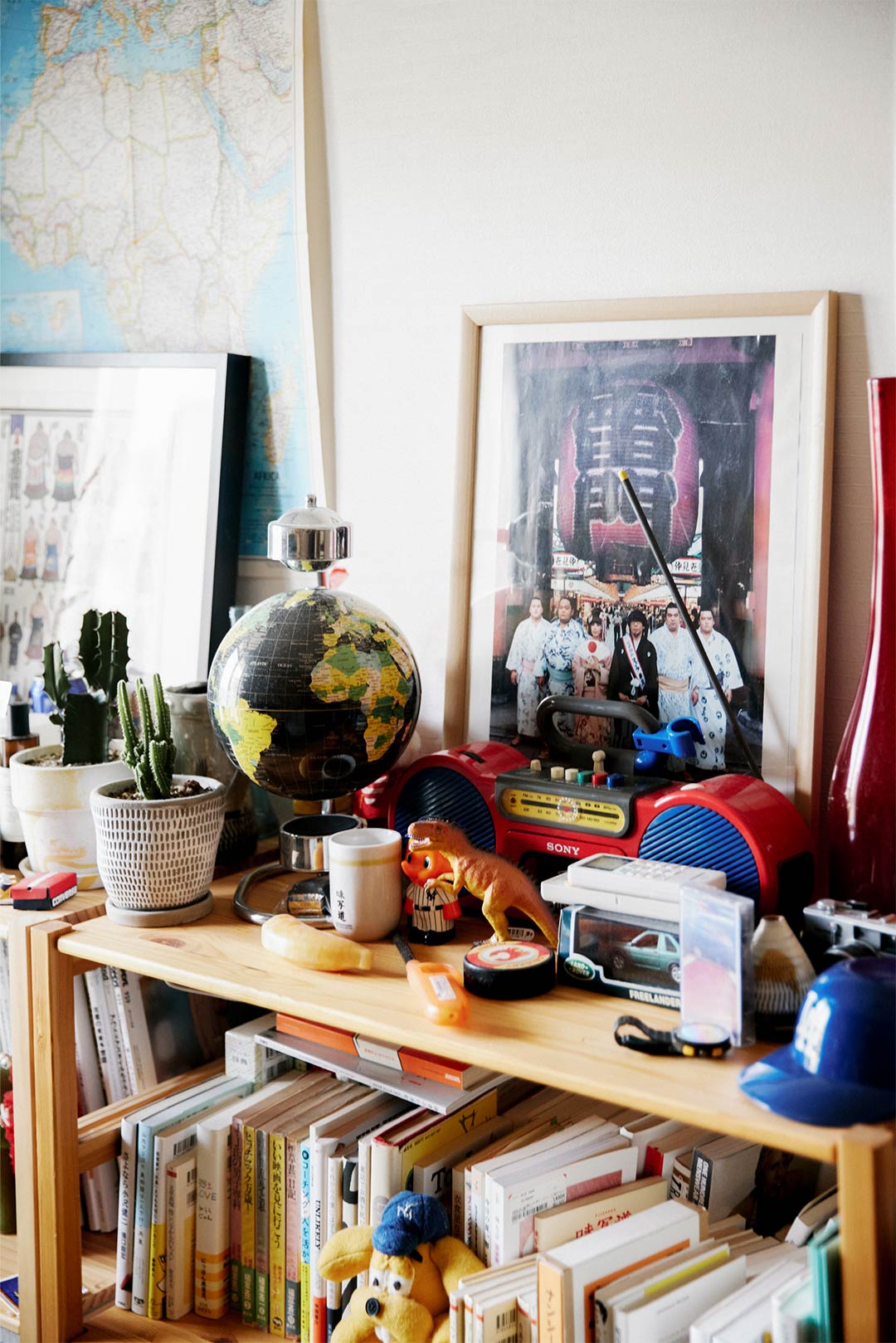 遊び心が散りばめられているインテリアのディレクションは、ユウヤさんが担当。「結婚するときに、その他の権利はすべて放棄するので部屋のアートディレクションは僕にやらせてくれ、とお願いしました。細々したものを含めて買ってから注意されたくなかったので、先に宣言したんです」(ユウヤさん)。少しずつコレクションされていった家具や雑貨は、民芸、ミッドセンチュリー、北欧などさまざまなテイスト。それでもまとまりがあるのはなぜだろうか。「感覚的なところが大きいですね」(ユウヤさん)。「夫も私も好きなものの軸があるので、どんなジャンルのアイテムを購入してもまとまりが出るのかもしれません」(千晴さん)