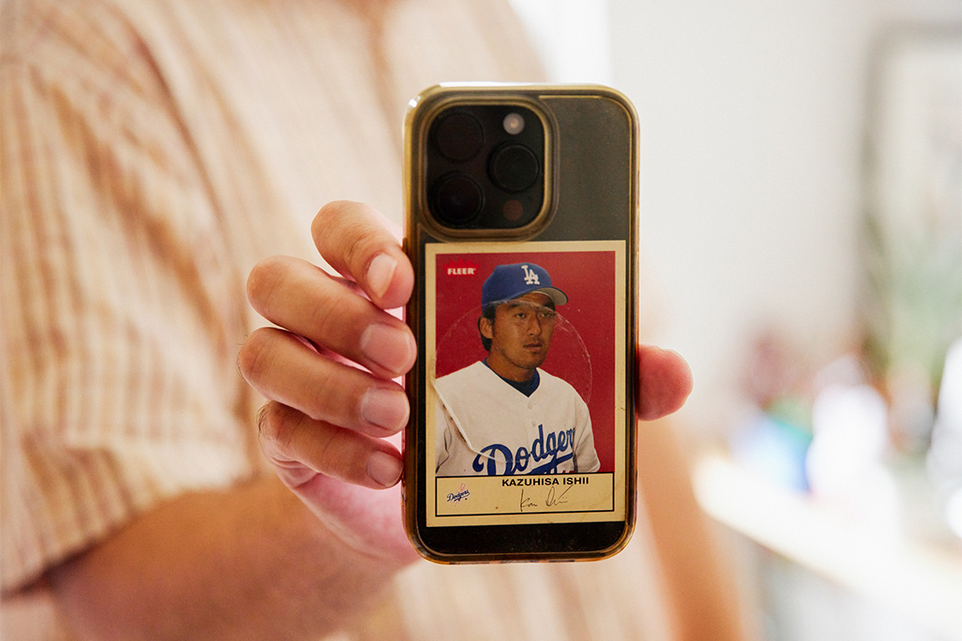 ZINEにも掲載されていたトレーディングカードは、スマホにセット。ポップな色使いがヤソメさん宅のインテリアともリンクする。