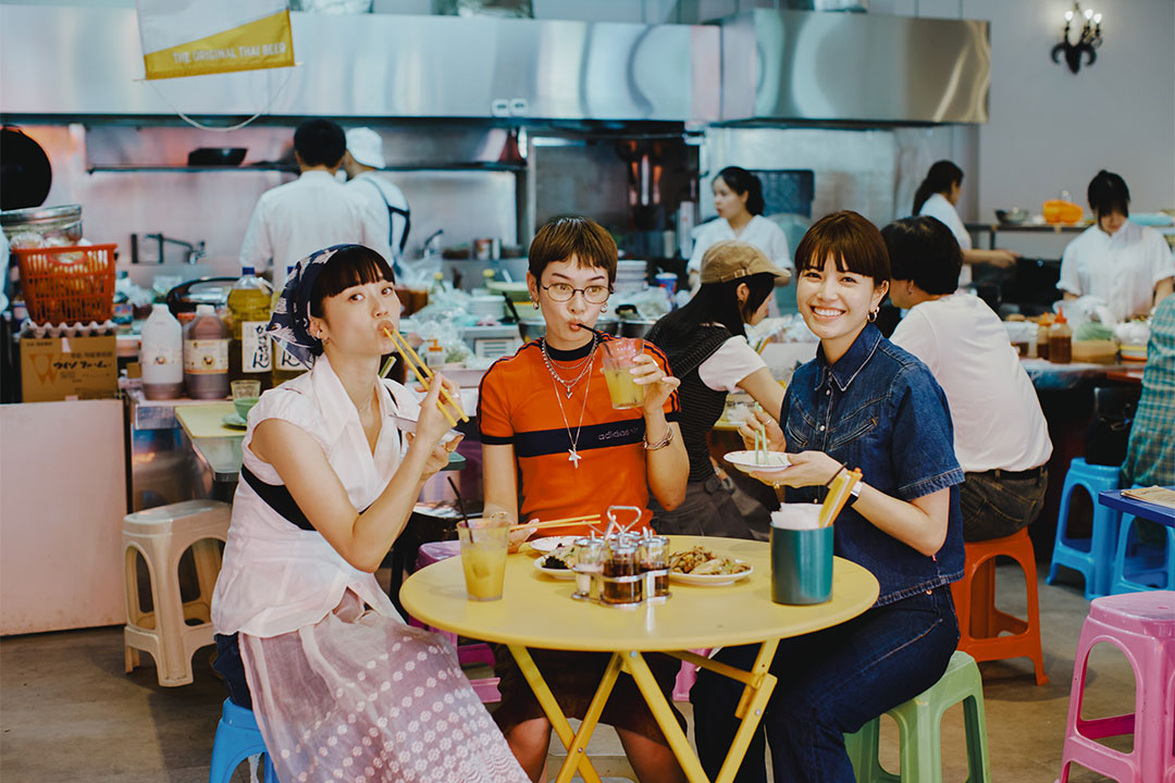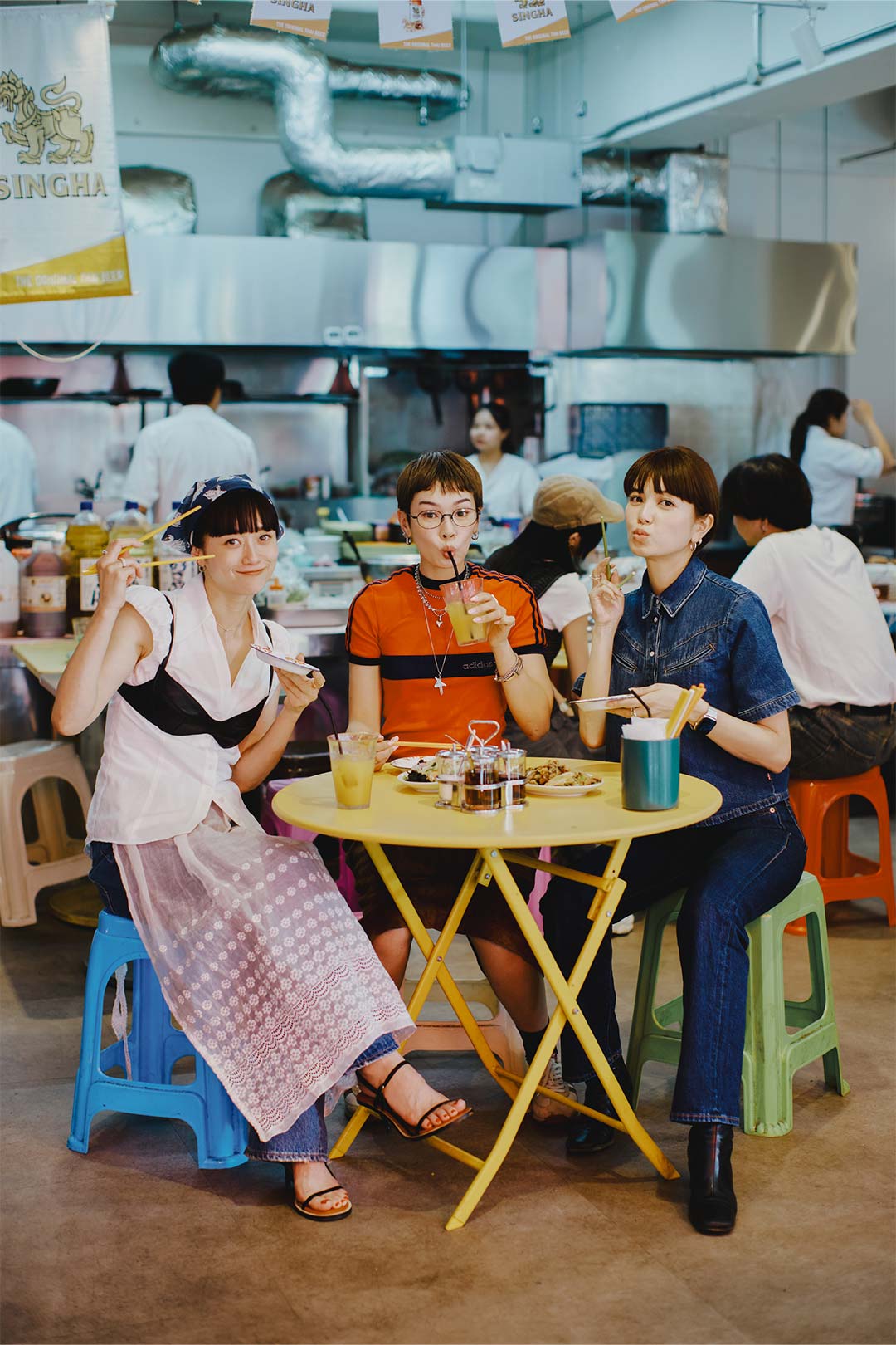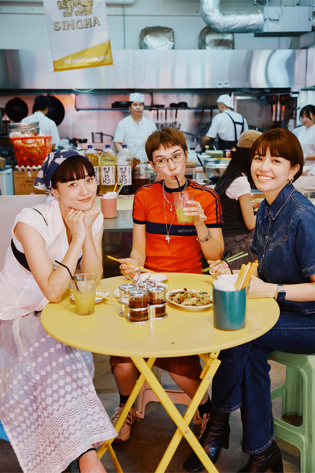 3人が夏によく訪れる、原宿にあるタイ&ベトナム料理〈チャオサンバンブー〉。ヤムウンセン、ゲソの唐辛子炒めは毎回オーダー。メインはガパオやフォーなど好きなものをそれぞれ注文。