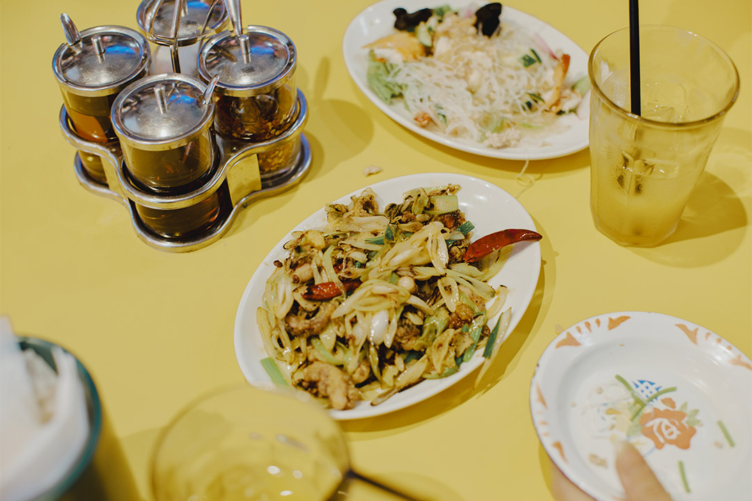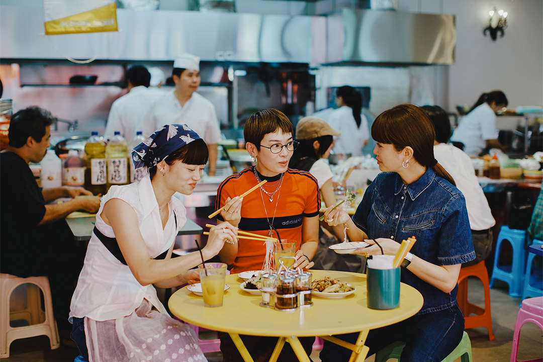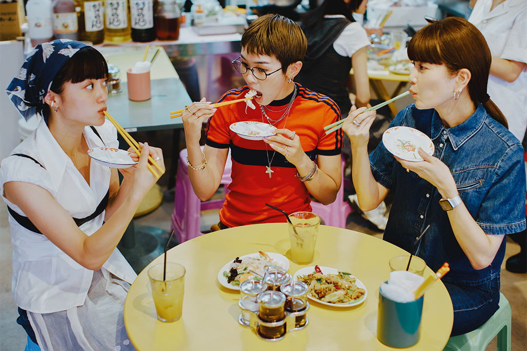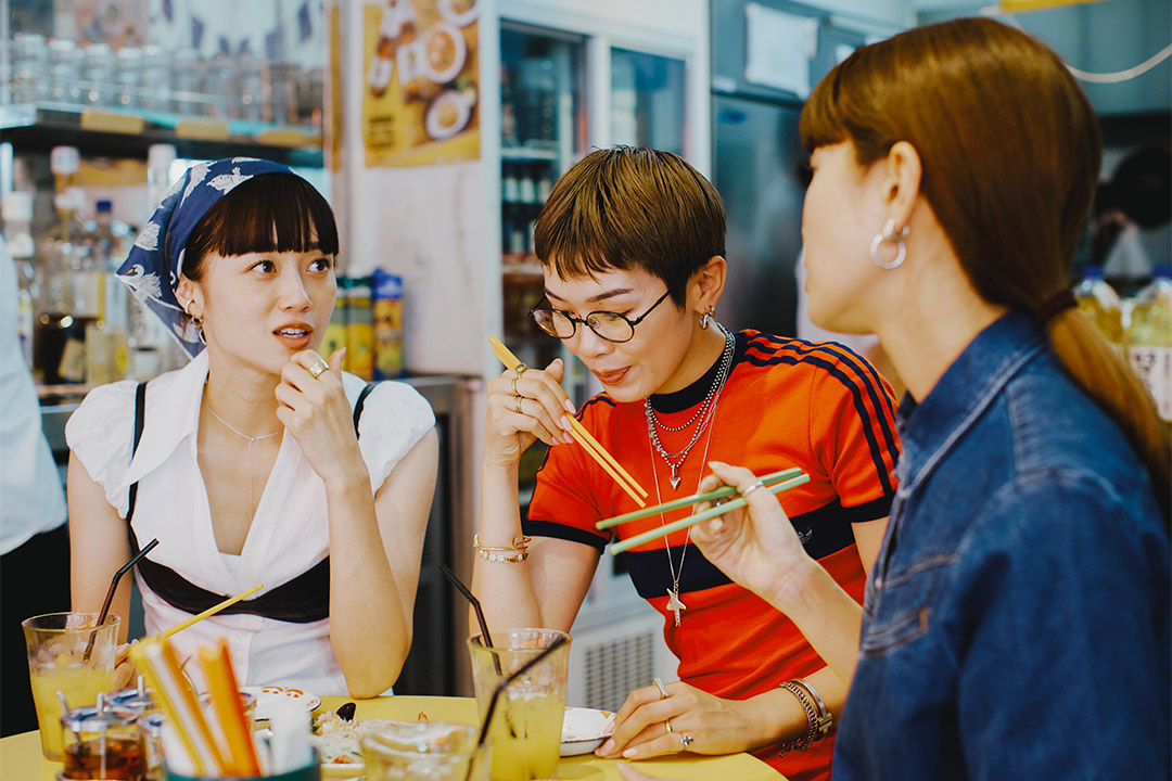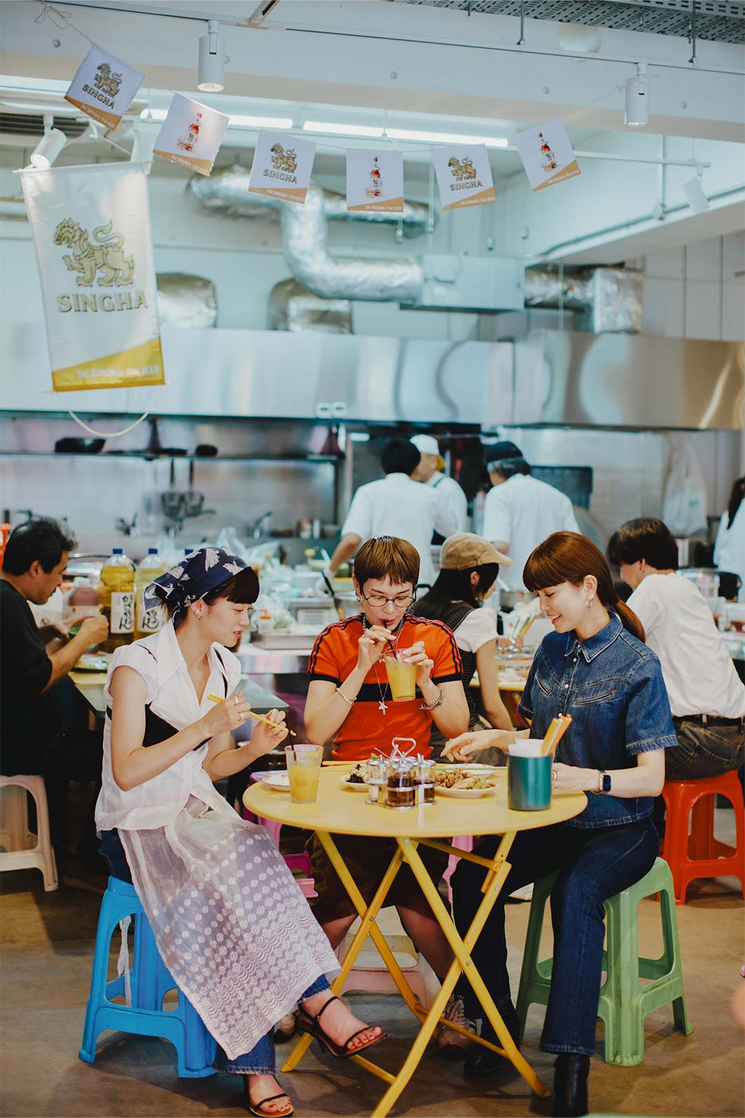 3人が夏によく訪れる、原宿にあるタイ&ベトナム料理〈チャオサンバンブー〉。ヤムウンセン、ゲソの唐辛子炒めは毎回オーダー。メインはガパオやフォーなど好きなものをそれぞれ注文。