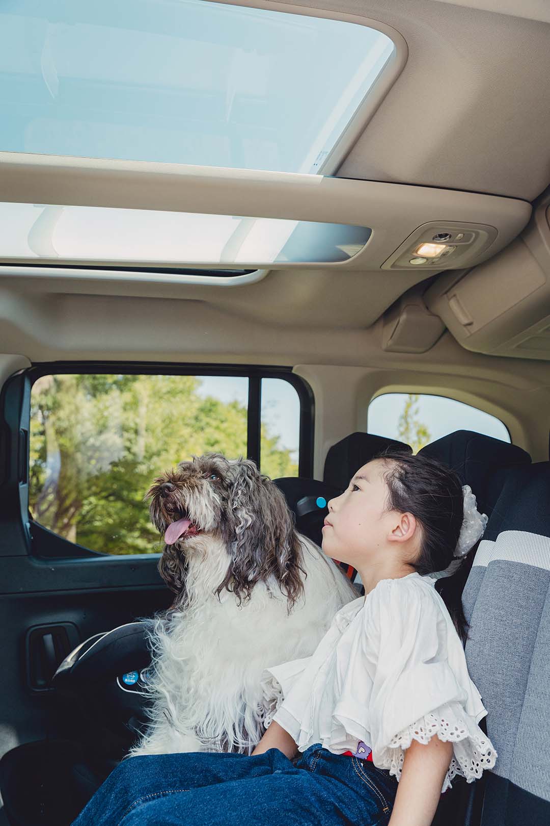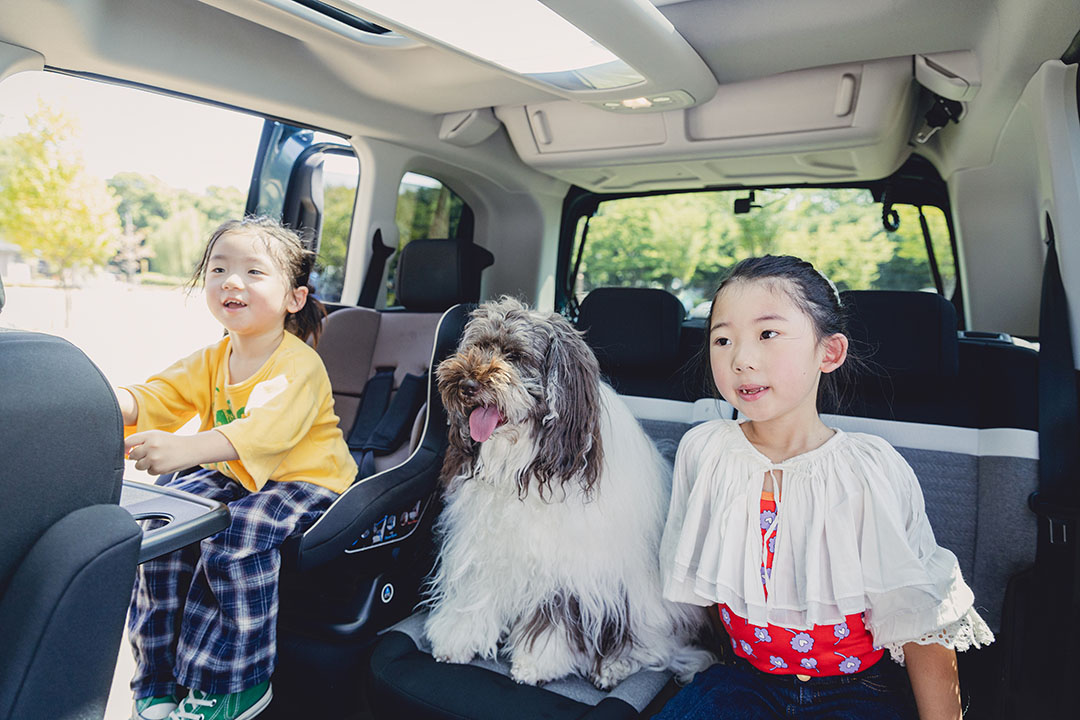 長距離ドライブをさらに快適にするのが、極上の開放感をもたらしてくれるパノラミックガラスルーフ。ゲージの中で退屈していたベンジーも、休憩中にリリちゃんのお隣に座り、空を眺めながら気分転換。ロングドライブでも、家族全員ストレスフリーで快適〜♪