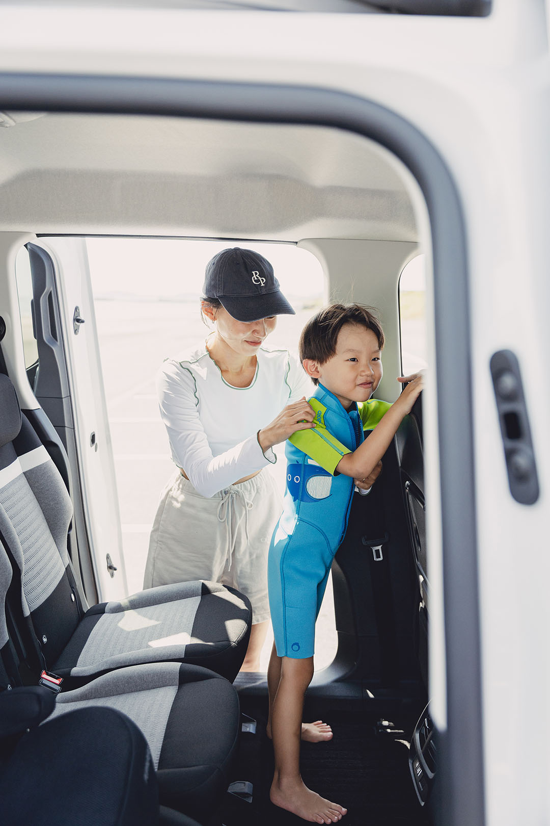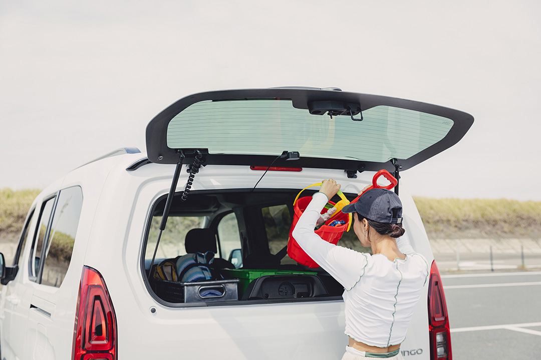 海水浴を楽しむ際、着替えをどうするのかは悩むところ……。そんなお悩み解決も、ベルランゴ ロングにおまかせ! 後部座席は大人3人が乗ってもゆとりのある空間が確保され、さらに天井も高いため圧迫感もなし。りくくんが立ったままでもお着替えができるほど!