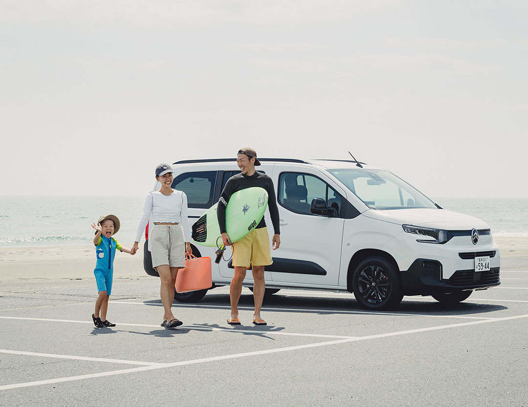 今日はベルランゴ ロングに乗って、千葉県の一宮海岸までドライブ。サーフィンデビューしたりくくんも波乗りに挑戦! サーフボードやボディボートなど、マリンスポーツの道具一式をラゲージスペースに詰め込んで、いざ海へ出発!