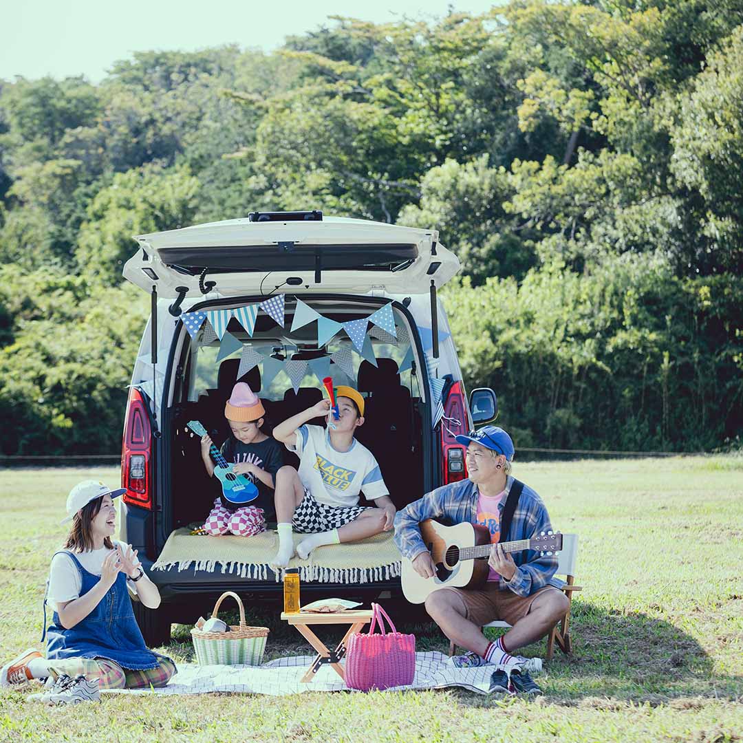 ベルランゴ ロングの3列目のシートは、折りたたんだり取り外したりと、用途によってカスタムが自在。今回はシートを取り外して、広々としたステージにチェンジ。ラグを敷いて、ガーランドを飾りつけ、お気に入りの楽器を手にすれば、ライブがスタート!