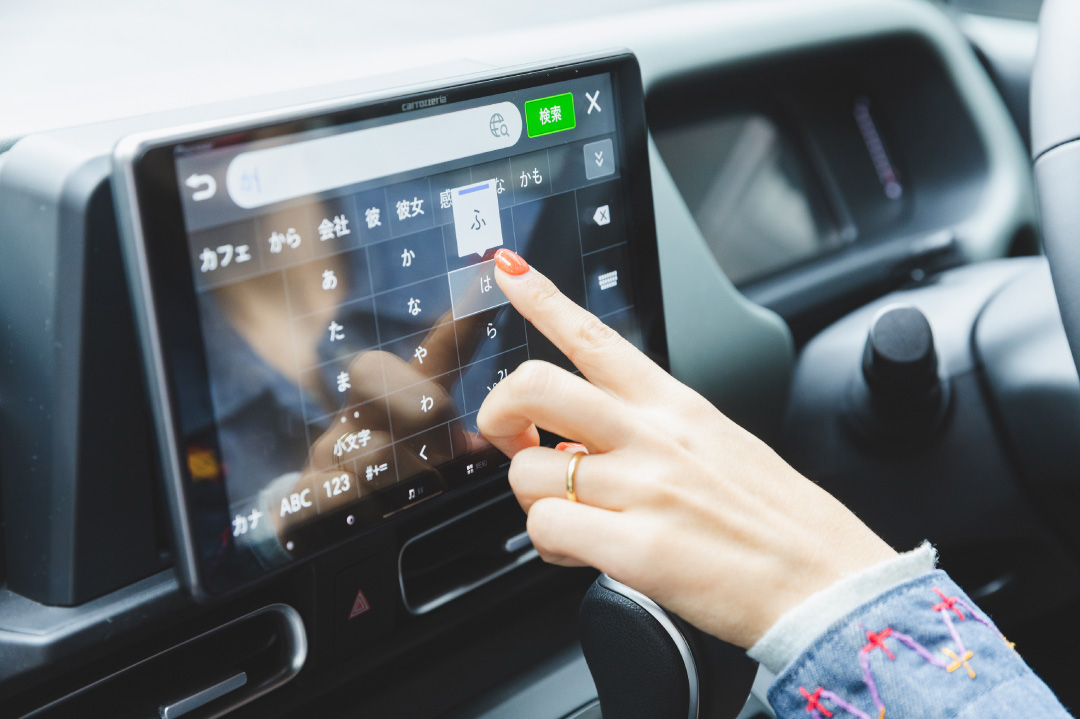「楽ナビ」はスマホと同じ操作性で、感覚的に使えて目的地検索もとってもスムーズ。検索画面はフリック入力に対応し、検索候補も表示。タッチパネルに50音がずらりと並んでいるデザインよりも、使い慣れた操作方法なら安心!