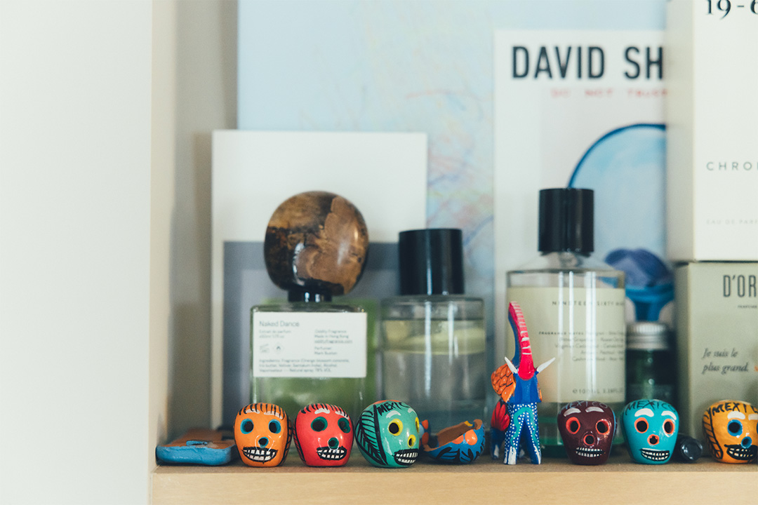 新婚旅行で訪れたメキシコで、ひとつ20円ほどで購入したという人形が、ニッチに並ぶ。「持って帰れることを基準に選んでいると、つい小さい人形を買いがちです。息子はこれをスイカと呼んでいます(笑)」(木綿さん)