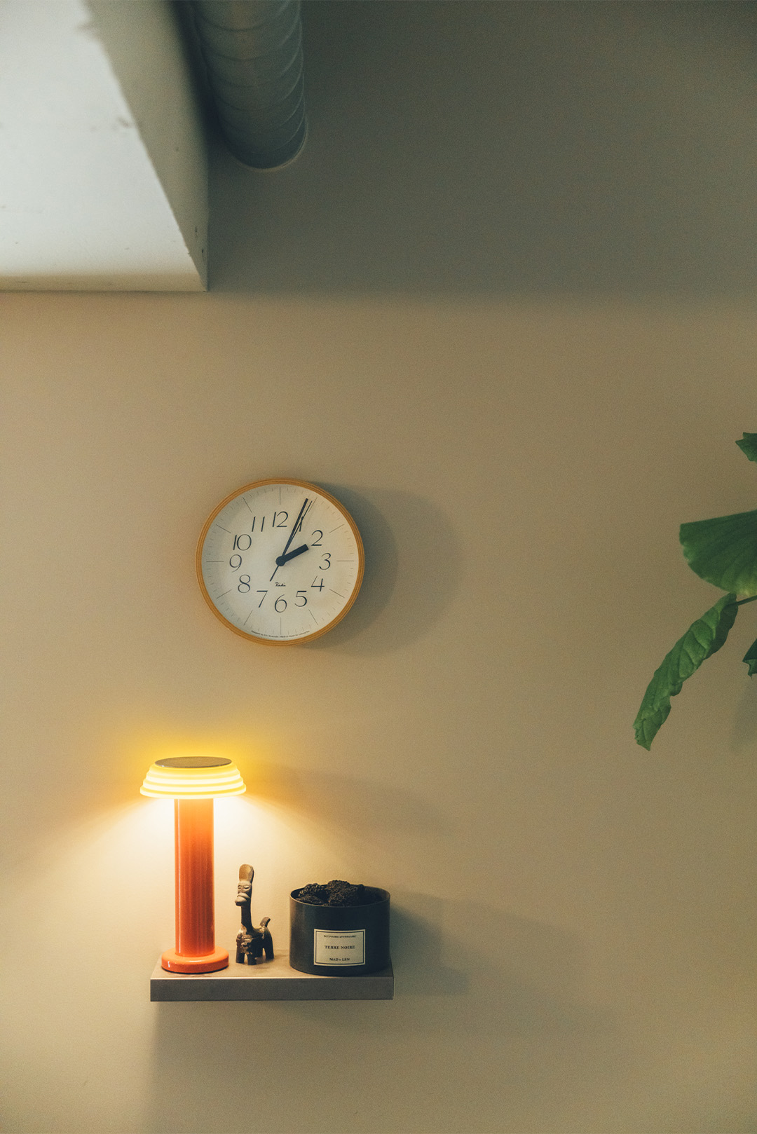壁面で時を刻むのは、〈Lemnos〉が日本を代表するプロダクトデザイナー・渡辺力とともに制作した〈RIKI CLOCK〉。DIYで取り付けた棚の上には、〈SowdenLight〉のポータブルライトがアクセントを添える。「ポップな色使いが気に入って購入しました。読書灯として活躍しています」(岳さん)