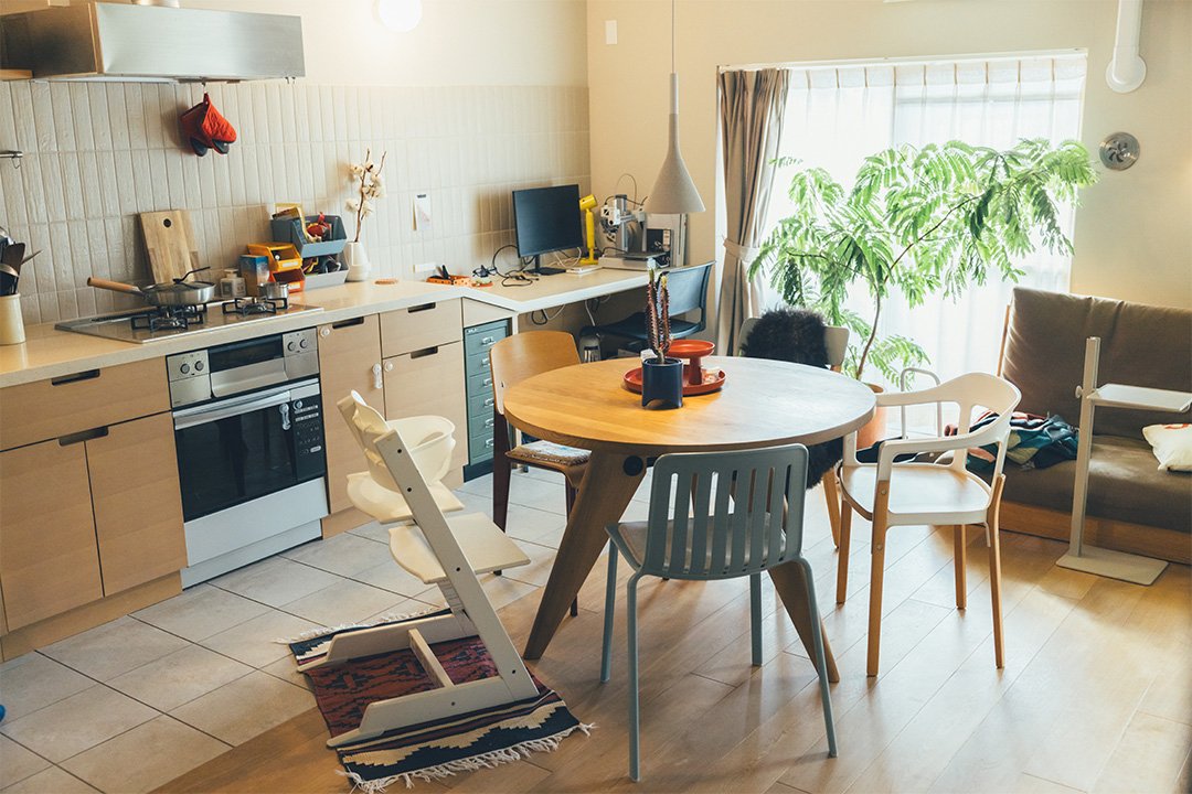 広々としたリビングを確保するために、キッチン、ダイニング、リビングをシームレスにしてひとつの空間に。壁一面に広がるキッチンは、岳さんのワークスペースまでつなげた天板と壁面タイルが個性を発揮。小松邸のシンボル的な存在となっている。ダイニングには、〈Vitra〉のテーブルを中心に、デザイナーズチェアが並ぶ。「好みが似ているので、インテリアで揉めることはないのですが、このテーブルだけは意見が対立しました。夫はスクエア派でしたが、家のなかはどうしても直線が増えてしまいがちなので、丸いデザインは入ることでやわらかみが出るのではないかと説得しました」(木綿さん)。「四角だと空間が狭く感じていたと思うので、説得してもらえてよかったなと思っています」(岳さん)