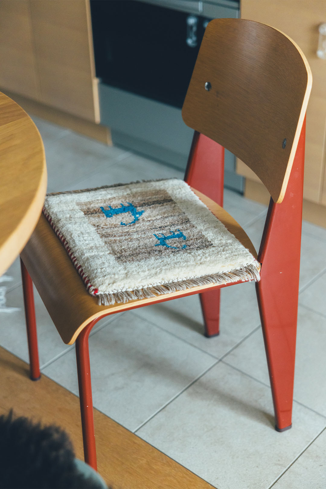 ダイニングテーブルと同じデザイナー、ジャン・プルーヴェが手掛けたチェアが一番のお気に入り。チェアのジャパニーズレッドとの相性を考えてオーク材やフローリングを選んだという。クッション代わりにイラン製のギャッペをオン。「サイズも色合いもぴったりで、お尻も痛くならないので気に入っています」(木綿さん)