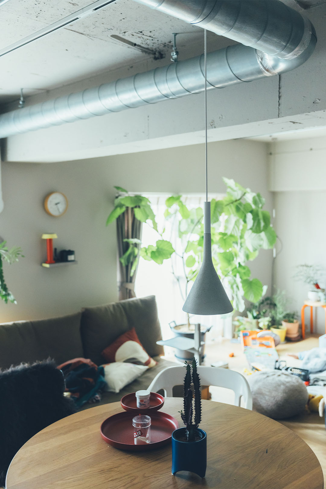 コンクリート製なのにぬくもりを感じる不思議なペンダントライトは、イタリアブランド〈FOSCARINI〉のAPLOMB。最近加わったというテーブル上の小物トレイは、ジャスパー・モリソンがデザインしたもの。「普段は息子が食べるふりかけが乗っています」(岳さん)