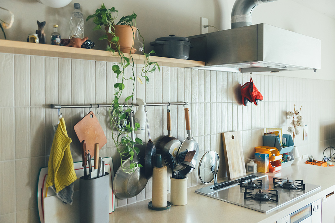 木綿さんのアイディアで取り入れたタイル。その寸法に合わせてキッチンのサイズを調整。飾り棚もレンジフードの高さも、気持ちのよい位置に収まっているのは、リノベーションだからできたデザイン。