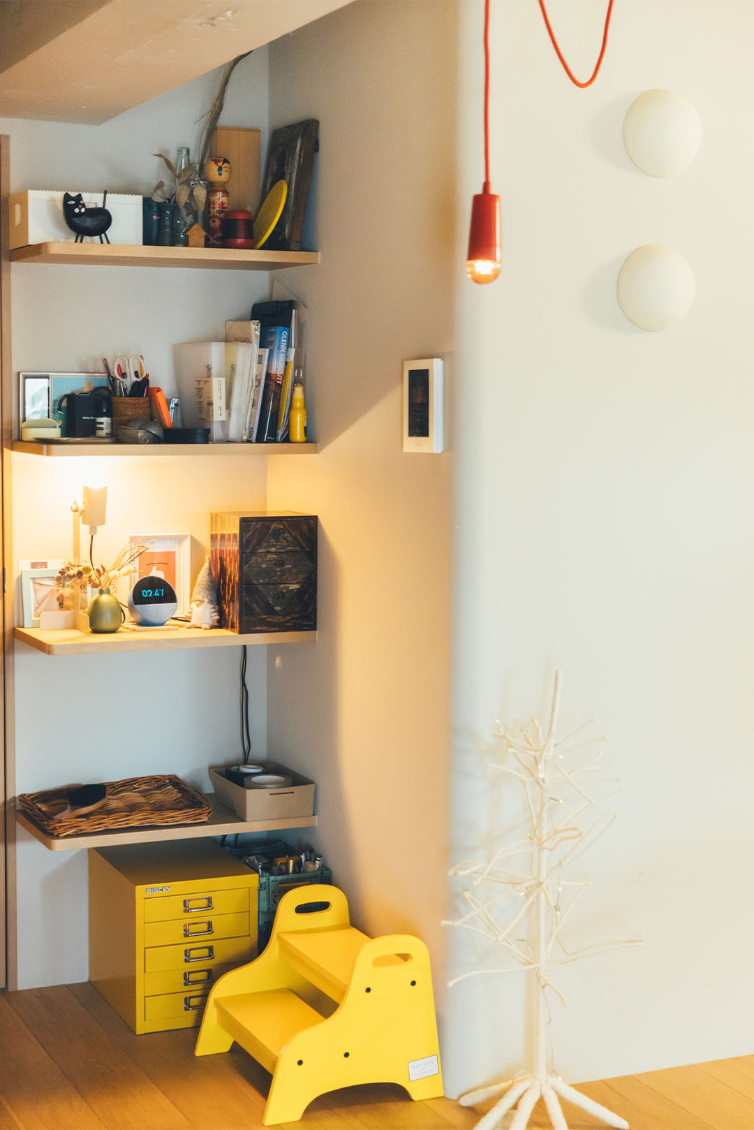 圧迫感を回避するために、収納はすべて見せる収納に。全造作棚は同じ規格の板材で統一されている。「ここはジャンル問わずにいろいろ置いてみよう!という棚です。上段にはこけしもいますし、一番下には〈BISLEY〉の小さなキャビネットも。手前にある黄色いステップツールは〈IKEA〉で購入しました」(岳さん)