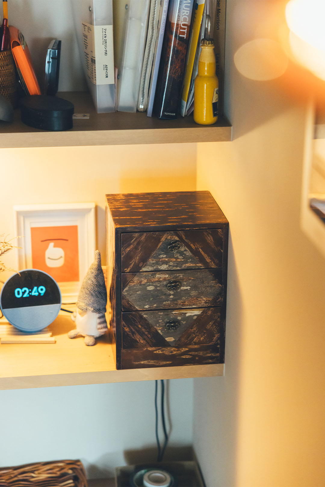 岳さんの出身でもある、秋田の伝統工芸の棚には細々としたものを収納。「結婚祝いに親族からいただいたものです。しっかりと家に馴染んでくれています」(岳さん)
