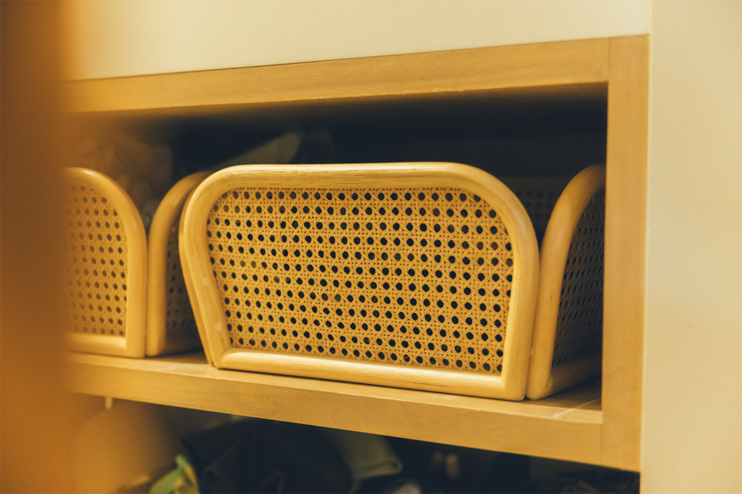 洗面台収納のサイズを決めた〈TOU〉のバスケット。「家を購入する前から気になっていたアイテムで、このバスケットが4つぴったりに収まるサイズで洗面台をつくってもらいました」(木綿さん)