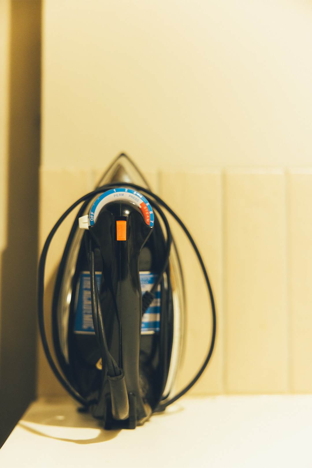 しっかりシワを伸ばしてくれるという噂を聞いて購入した〈D.B.K.社〉のスチーム&ドライ・アイロン。ドイツらしい機能美は、置いておくだけでアクセントに。