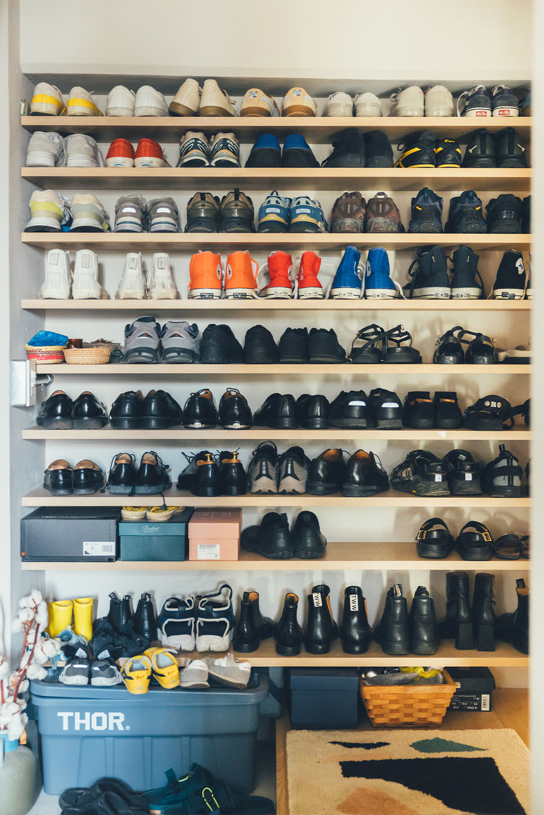 小松邸に入ってまず目を引く特大のシューズラックにも、緻密な計算が施されている。「手持ちのシューズの高さを測って、ぴったり収まるように一段ずつの高さを調整してもらいました。コンバースのハイカットだけが並ぶ段もあります」(岳さん)
