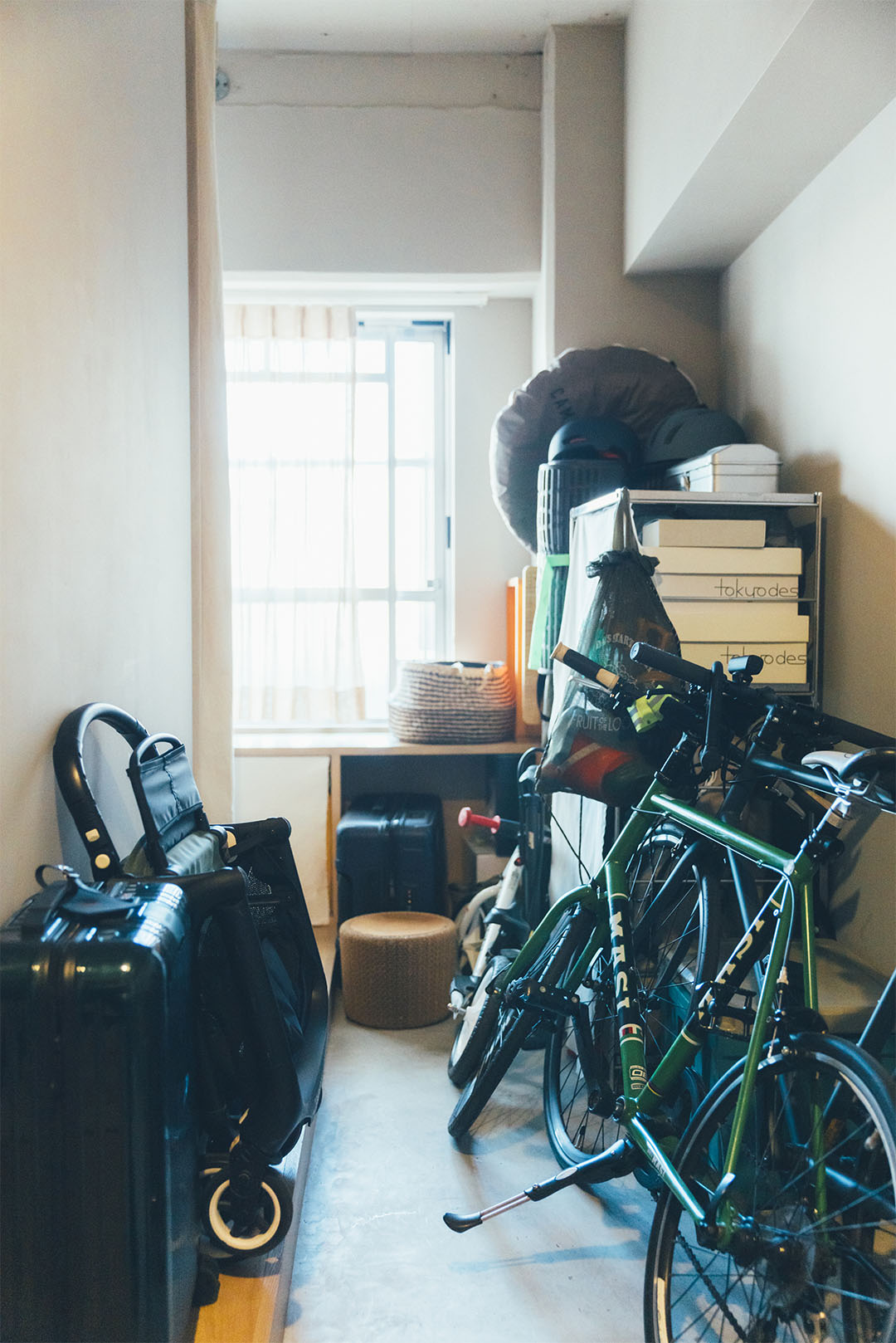 自転車やキャンプグッズが並ぶ土間は、早い段階で設計をお願いしていた部分。「寝室に抜ける道を確保して、玄関にも光が入るようにしました。ベビーカーを折りたたまずに置くことができたので、つくってよかったなと感じています」(木綿さん)