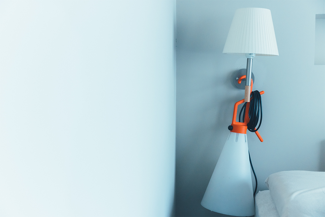 寝かしつけ時に活躍しているという〈FLOS〉のMAYDAY。オレンジカラーがインテリアのアクセントにもなり、キャンプもこなせる万能ライト。