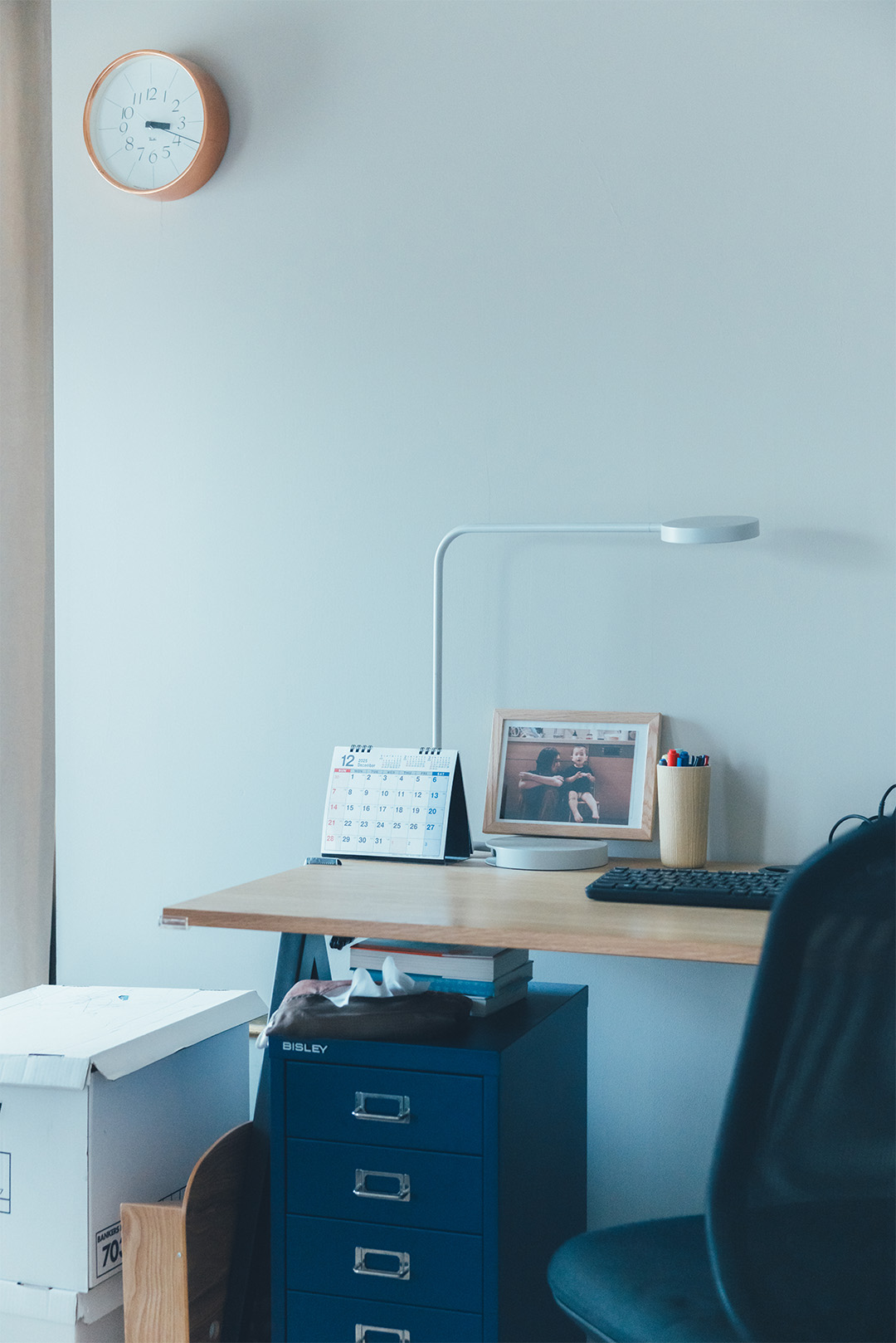 お互いのワークスペースに物理的な距離を取るため、木綿さんは寝室にデスクを設置。〈HAY〉のデスク下からのぞく〈BISLEY〉のブラックキャビネットが、グレージュのやさしい空間を引き締める。時計はリビング同様、渡辺力さんがデザインを手掛けた〈Lemnos〉のRIKI STEEL CLOCK。