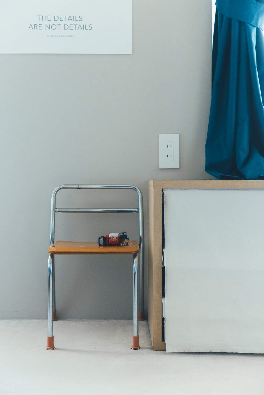 寝室の床はすべてホワイト調の絨毯。そこに白くんが生まれる前にヴィンテージショップで購入したという小さな椅子がインテリアの一部として並ぶ。「まだ足が届かないのですが、ときどき息子も座っています」(木綿さん)