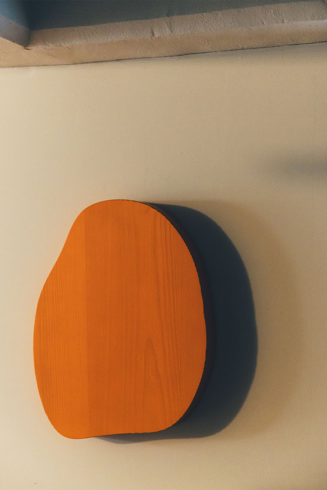 玄関の正面では、〈FRAMA〉のオブジェがあたたかく出迎える。流線的なアウトラインや存在感のあるオレンジカラーが、不思議とグレージュの空間に溶け込む。